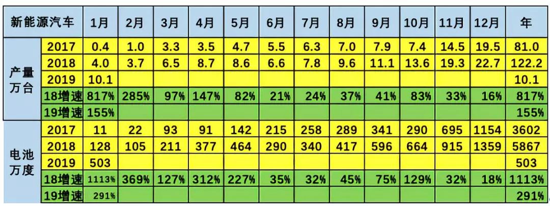 2019年1月的新能源车爆发增长到10.1万台,电池增长到503万度,同比增长291%,开局超强。由于电池的增速高于整车的增速,这也是体现了新能源车对电池的拉动贡献,对行业贡献很好。
