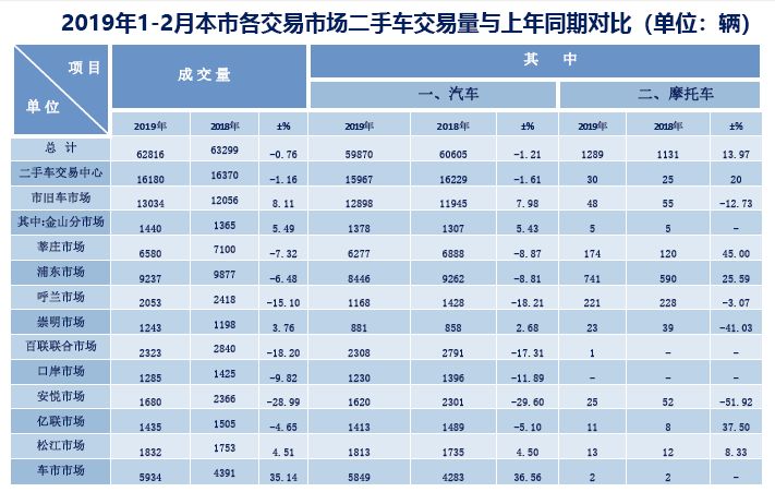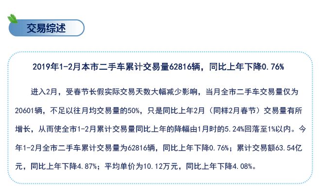 上海二手车协会:2019年1-2月份上海二手车简报 2019年1-2月上海市二手车累计交易量62816辆,同比上年下降0.76%,累计交易额63.54亿元,同比上年下降4.87%,具体分析如下: 更多阅读:上海二手车协会:2019年1-9月上海市二手车交易分析上海二手车协会:2019年1-7月上海市二手车交易分析上海二手车协会:2019年1月上海二手车交易分析上海二手车协会:2019年1-3月上海市二手车累计交易量109581辆,同比上年微增0.3%上海二手车协会:2020年1-6月上海市二手车交易市场上海二手车协会: 2020年1-5月上海二手车市场分析上海二手车协会:2020年1-3月上海二手车交易数据上海二手车协会:2020年1-2月上海二手车市场分析上海二手车协会:2019年1-12月上海市二手车交易分析上海二手车协会:2019年1-6月上海二手车交易分析CCFA:2019年中国超市百强Demand Gen :制造商将数字转换扩展到销售和营销报告数字之旅的时代启幕——空间计算前程无忧:2021年Q1集成电路/半导体市场供需报告乐普医疗新冠病毒抗体胶体金法检测试剂盒、红外测温仪等产品已供往数十国家