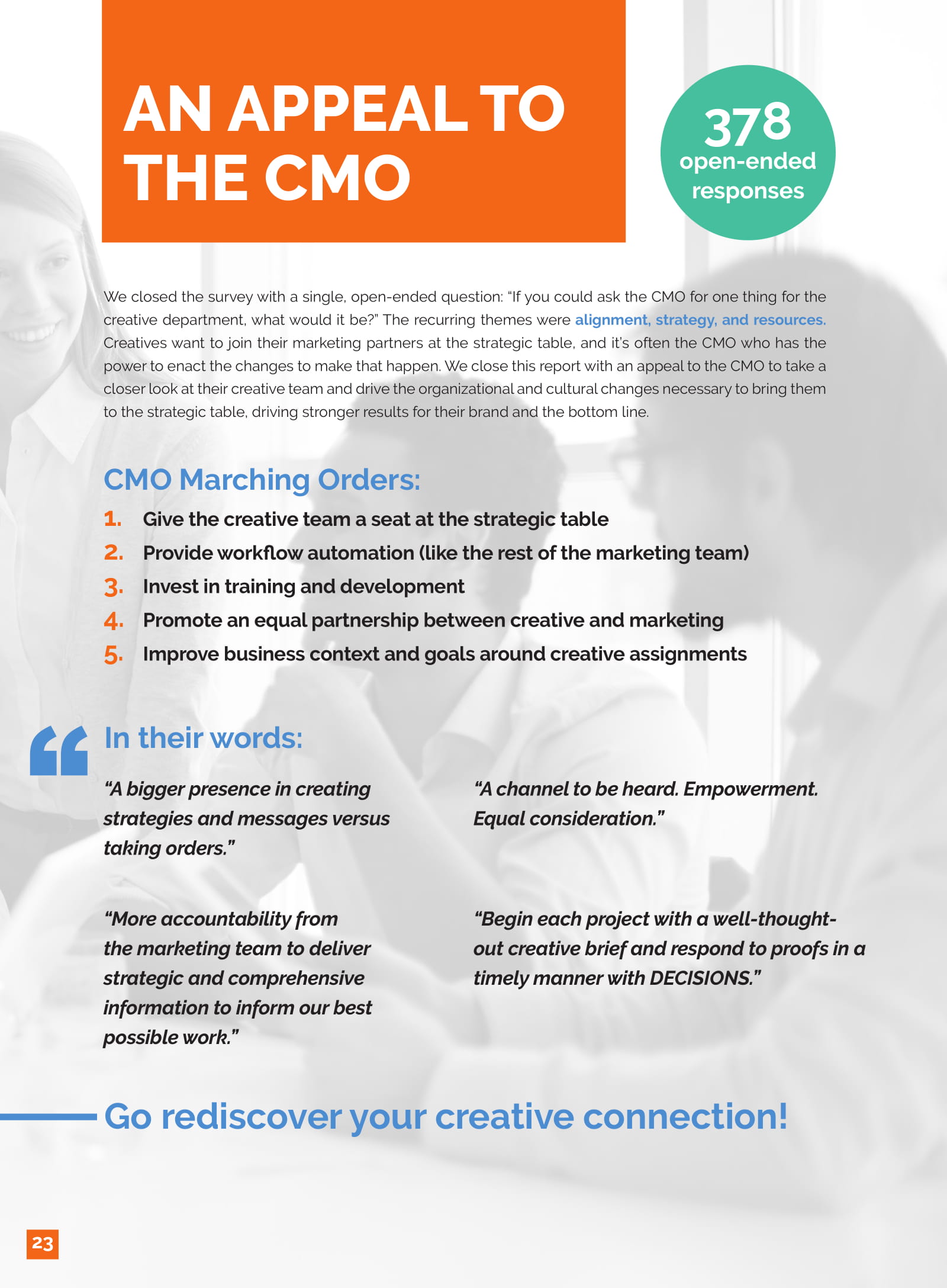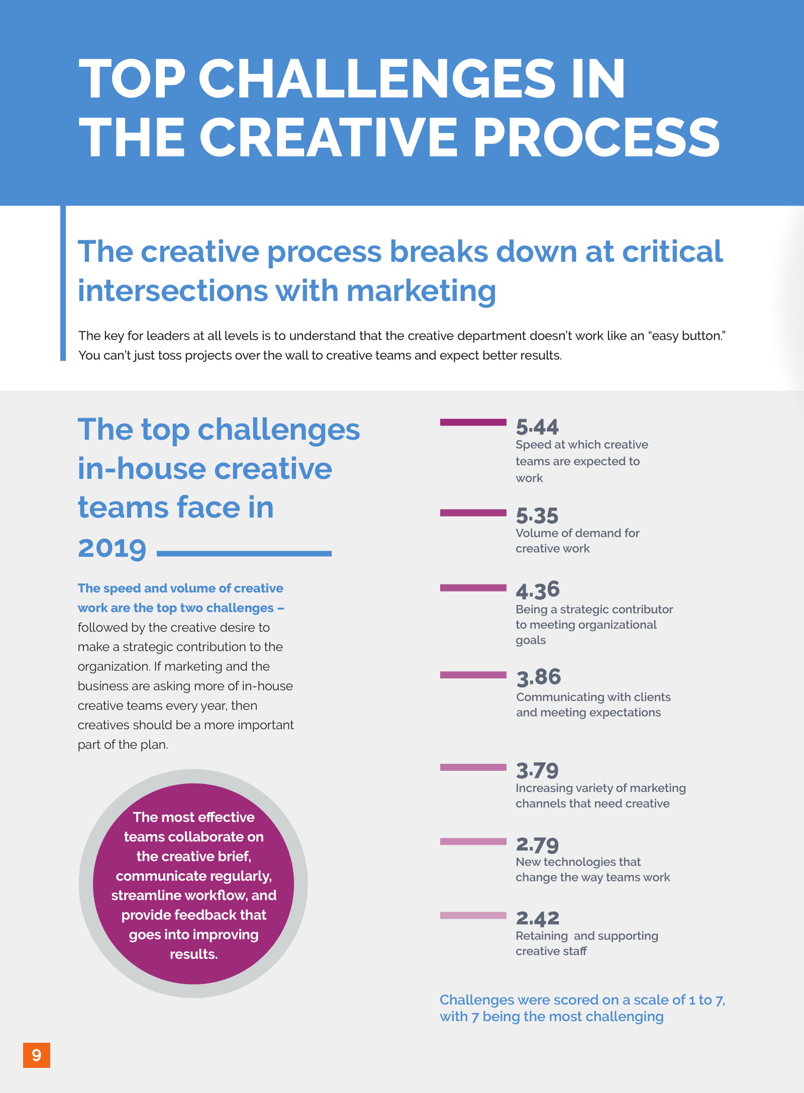 有效的沟通也是挑战之一,例如创意简报缺少袭击。只有20%的受访者认为企业内的创意简报是完整的、全面的;相比之下,58%的受访者不同意这种说法。