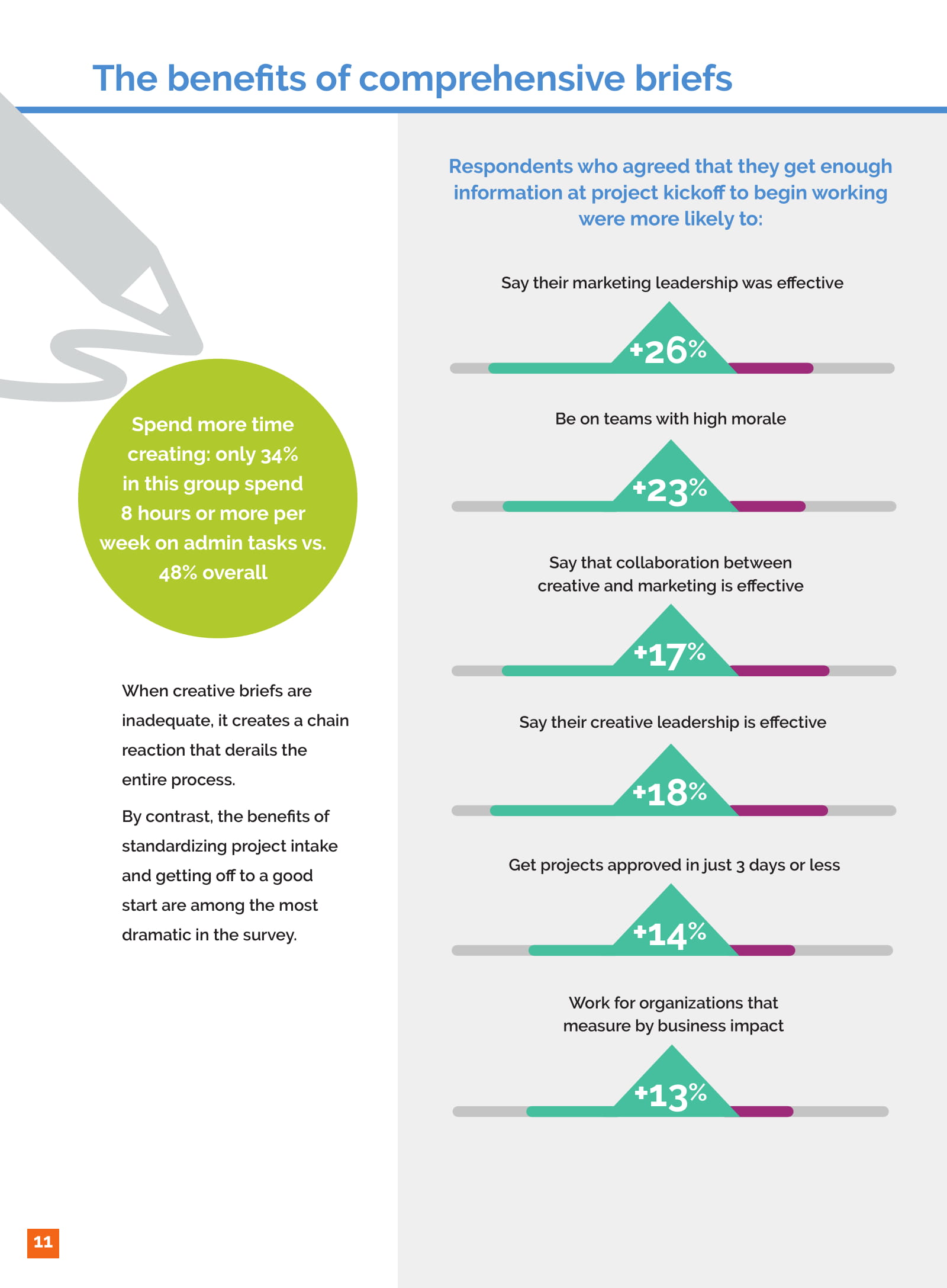的确,在项目启动时提供足够的信息似乎与一系列积极的指标相关。1/5的人表示他们得到了足够的细节,士气高涨的可能性提高23%,营销和创意之间的合作效率提高17%。