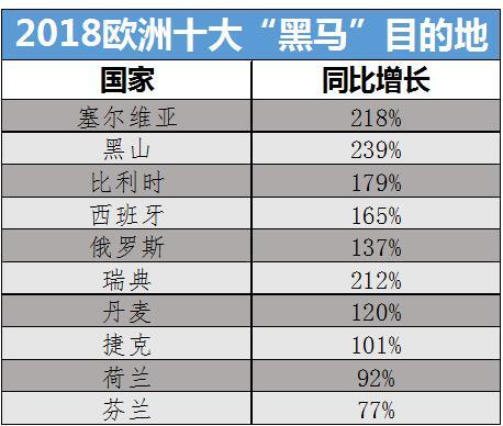 2018年,中国游客人次增量最多的欧洲目的地国家有:塞尔维亚、比利时、西班牙、俄罗斯、瑞典、丹麦、捷克、荷兰、芬兰等。作为欧洲首个对华免签国,塞尔维亚近年来已成为中国新兴欧洲游目的地,其相对较低的旅游花费和欧洲风情颇得游客青睐。黑山推出的有条件免签政策进一步便利了国人赴黑山旅游。得益于中俄双方政治交好以及2018年世界杯的举办,2018年赴俄旅游人数蹿升。北欧五国越来越受到中国游客关注,丹麦游客增长120%,芬兰增长77%,主要前往首都赫尔辛基、拉普兰地区看极光、游览圣诞老人村等。