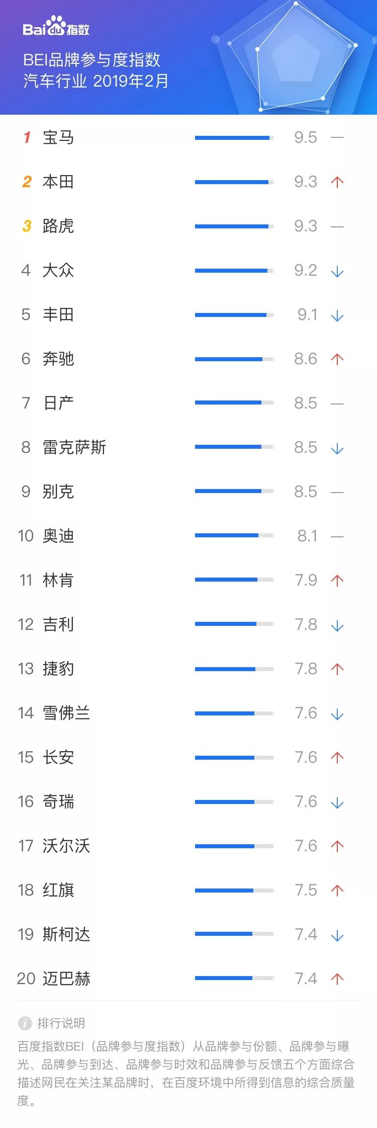在2月的榜单中,宝马获得第一名,本田、路虎、大众、丰田紧随其后,奔驰、日产、雷克萨斯、别克和奥迪分列第六至第十名。