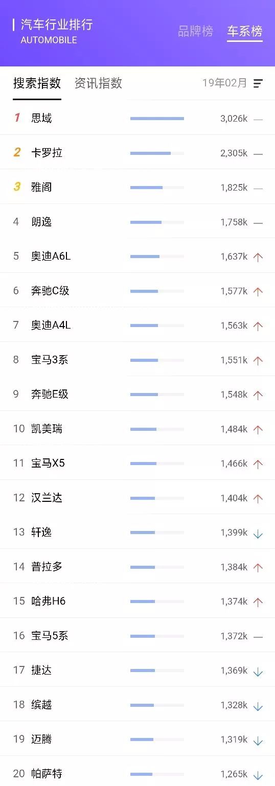 在2月的车系榜中我们可以看到,思域排名第1,卡罗拉、雅阁、朗逸、奥迪A6L紧随其后,6-10名分别是奔驰C级、奥迪A4L、宝马3系、奔驰E级和凯美瑞。