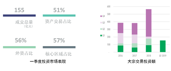 - 2019年第一季度,北京共录得8笔大宗交易,交易总额达155亿人民币,同比上升69%。