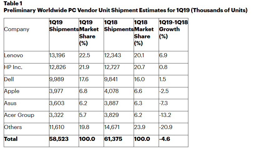 根据Gartner公司的初步结果,2019年第一季度全球PC出货量共计5850万台,同比下降4.6%。