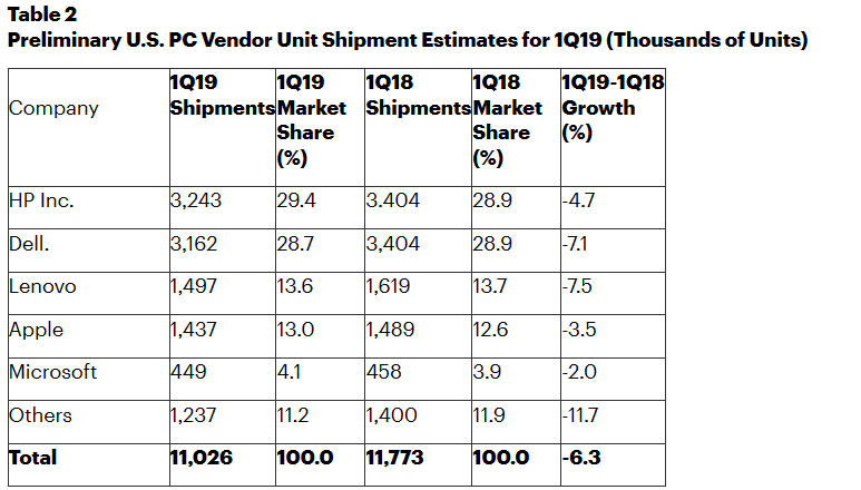 2019年第一季度美国PC出货量总计1100万台,比去年同期下降6.3%。惠普在美国的市场份额上升到29.4%,排名第一。戴尔占据第二位,其出货量下降7.1%,2019年第一季度在美国的市场份额为28.7%(参见表2)。