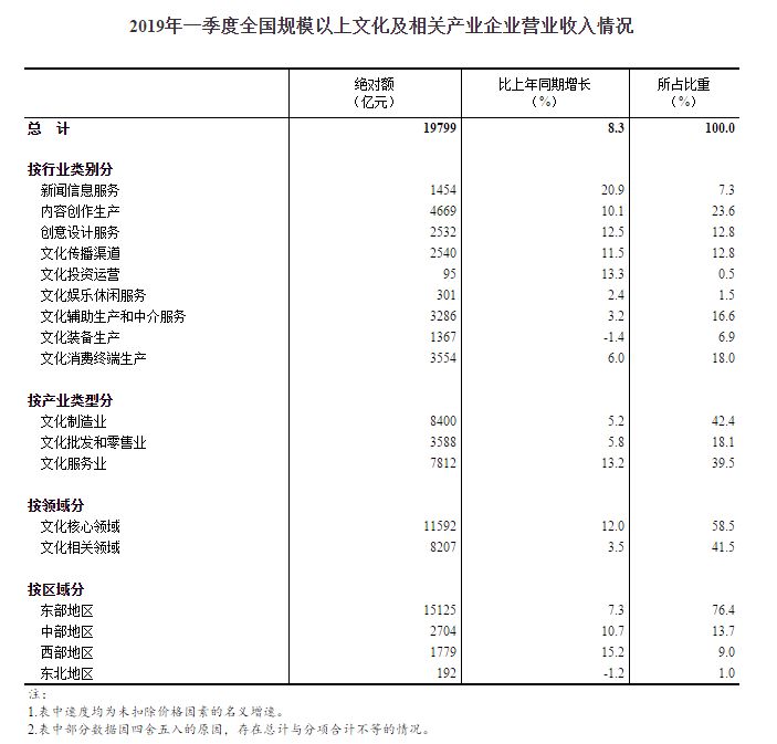 据对全国规模以上文化及相关产业5.5万家企业调查,2019年一季度,上述企业实现营业收入19799亿元,按可比口径计算(详见附注6)比上年同期增长8.3%[1]。