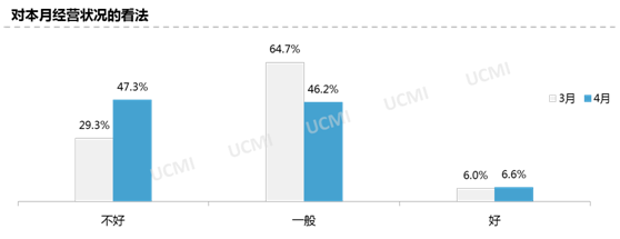 调查显示,经销商认为4月份的经营状况不好,认为经营状况“一般”的比例为46.2%,认为“好”的比例为6.6%,认为“不好”的经销商比例为47.3%。整体市场环境不理想,新车价格冲击,销量下降,整体经营状况不好
