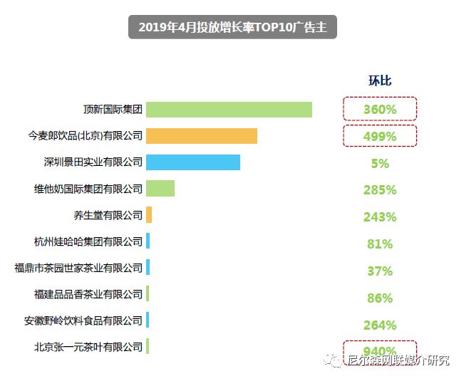 康师傅、味全品牌所隶属的顶新国际集团在电视媒体投放最多,并在互联网视频、手机APP上均有增加;小罐茶在电视的投放已进入缓冲期,并逐渐转向电台市场,较3月增长12%;香飘飘品牌在手机APP上的投放有所下降,但投放量依然最多。
