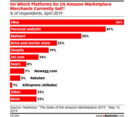 对于亚马逊卖家来说,eBay是第二受欢迎的选择(56%),超过了独立站、沃尔玛、实体店和其他更小的在线平台。