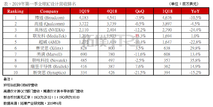 根据集邦咨询(TrendForce)旗下拓墣产业研究院最新统计,2019年第一季全球前十大IC设计业者营收及排名出炉,前五名中仅有联发科维持小幅成长,其余包含博通、高通、英伟达与超威皆出现衰退,其中英伟达因库存尚未完全去化,衰退幅度最大,达24.4%。
