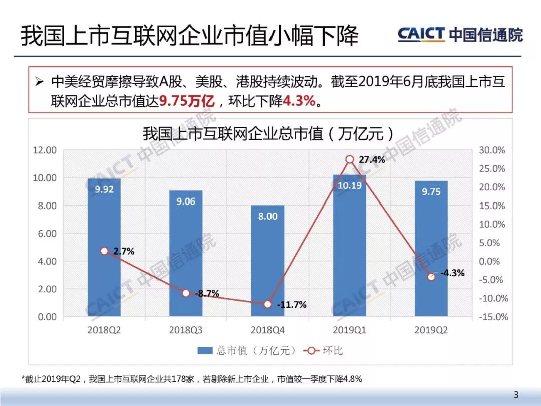 - 市值方面,2019年Q2我国上市互联网企业市值小幅下降。