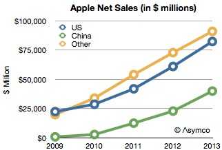 2009年苹果中国的财政销售收入仅为7.69亿美元,到了2012年却已达到228亿美元。中国区销售的三年增长几乎相当于美国33年的增长。