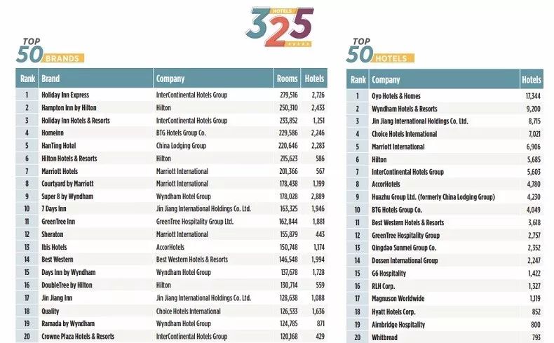 “全球酒店集团325强”排名的数据来自在线调查收集,由酒店公司联系人完成,要求填报酒店截至2018年12月31日,整体运营的客房和酒店数量。没有做出回应的公司,将通过公开记录、前几年的数据、行业来源和独立研究,进行估算。