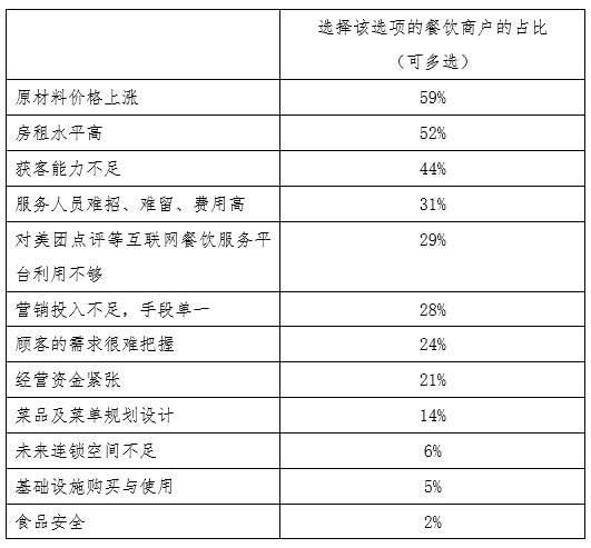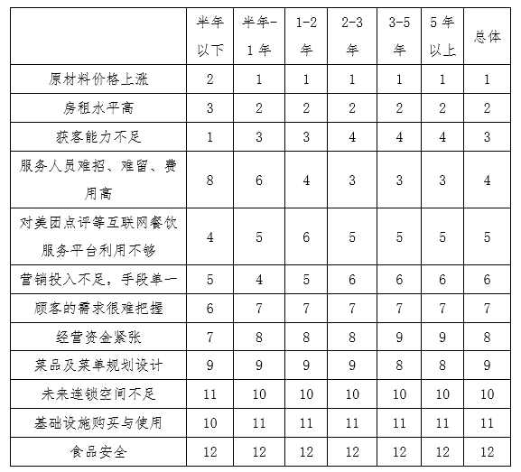 注:表中数字1-12代表餐饮商户经营痛点的排名次序,1代表程度最重,12代表程度最轻。