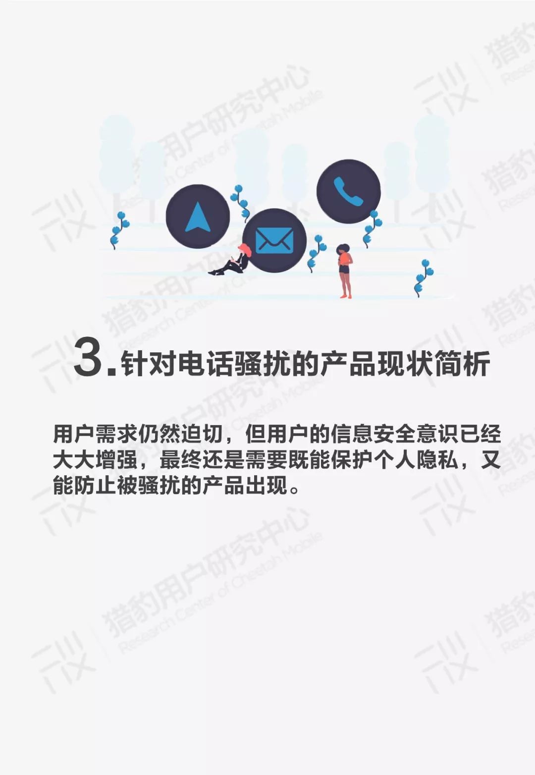 AI电话机器人防骚扰调研:用AI来对抗AI 2018年8月,国家出台《综合整治骚扰电话专项行动方案》,在全国开展治理骚扰电话行动,今年“315”晚会上,央视点名曝光电话机器人拨打骚扰电话乱象。电话骚扰问题久治不愈已成顽疾,随着AI电话机器人的诞生,用户接到电话骚扰的数量更是与日俱增。 那么我们能否换个思路,以子之矛攻子之盾,让AI机器人替代传统防骚扰软件,保护用户不被电话骚扰? 由此猎豹用户研究中心开展AI电话机器人防骚扰研究专项,在全国范围内收取有效样本7990份,覆盖各年龄段及地区,希望可以通过这份调研报告,反映当前用户对AI电话机器人的认知,探索AI电话机器人防骚扰产品的潜在发展市场。 核心发现: 1、AI可以是骚扰电话的催化剂,也可以是抑制剂;用户对防骚扰产品有很强的需求。 2、防骚扰产品的目标用户群体: 成年男女:青年、中年群体,既有骚扰困扰,又愿意尝试新鲜事物和产品。 另,老年群体虽然也有骚扰电话困扰,但是对防骚扰产品的需求较低,他们宁愿直接挂掉骚扰电话。 3、用户对待骚扰电话的行为: 三成用户每天都会接到骚扰电话; 用户感觉到骚扰电话越来越多了; 用户对待骚扰电话的方式多是:直接拒听; 用户逐渐感知到机器人的电话营销,用户也希望机器人能辅助自己,来处理骚扰电话; 用户在使用防骚扰产品时,担心有用的电话被拒接,用户希望能够进行特定的回复。 以下为报告全文: 更多阅读:产业转型的新引擎:AI如何驱动跨行业迈入规模化落地时代埃森哲:AI对16个行业以及12个经济体的影响谷歌:4Q17营收增长止不住利润下滑,新业务营收贡献仍微不足道英伟达:1Q19数据中心,游戏和加密货币继续推动营收增长英国科进咨询:70%英国员工认为AI对工作场所影响积极CMO革命:AI 赋能实现五大增长突破Gartner:2026年全球AI支出达到 2.52 万亿美元 同比增长44%跨越信任鸿沟:AI在科研与医疗领域深度应用的核心挑战调查显示44%美国职场人士预计五年内岗位被AI部分取代CB Insights:预计AI将为制药行业创造超过3500 亿美元的年均价值关税动荡,AI能如何应对全球贸易变局?2024年Google搜索收入达1980亿美元 占Alphabet总收入近60%IDC:2027年企业AI支出将超过300亿美元百度:2024年AI日均调用量超15亿次 文库AI付费用户突破4000万对话式体验:AI在客户交互领域中尚未释放的巨大潜力
