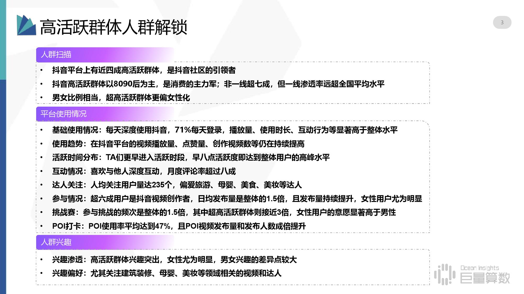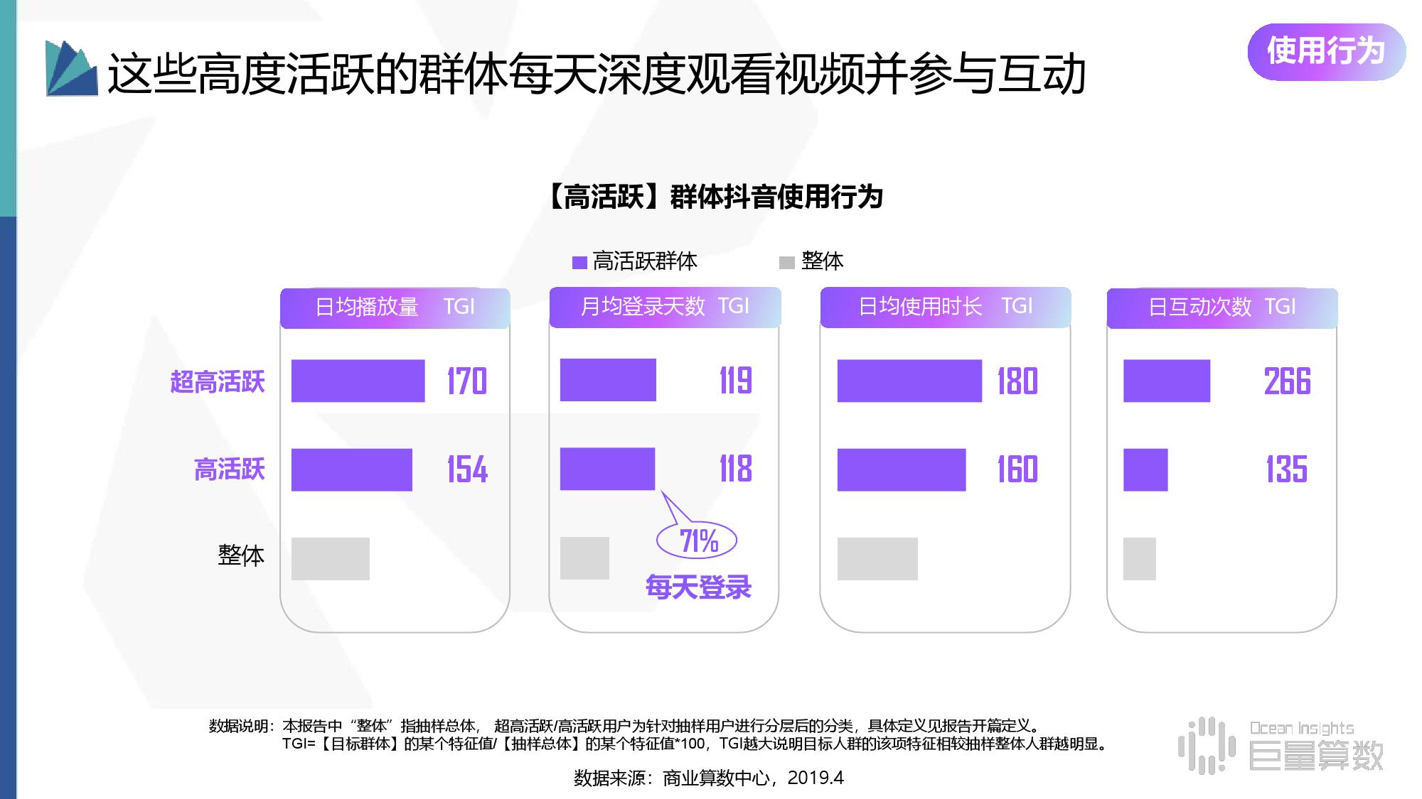 • 基础使用情况:每天深度使用抖音,71%每天登录,播放量、使用时长、互动行为等显著高于整体水平