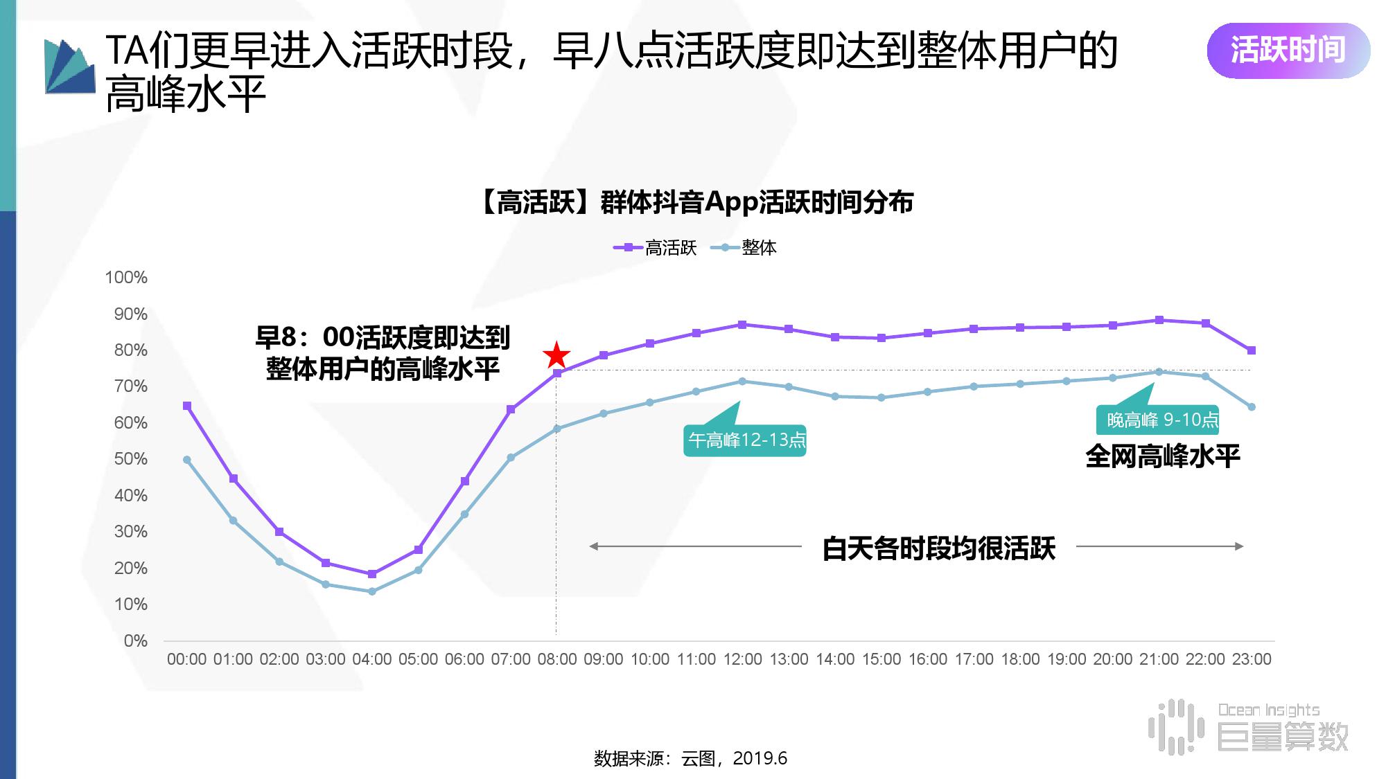 • 活跃时间分布:TA们更早进入活跃时段,早八点活跃度即达到整体用户的高峰水平。