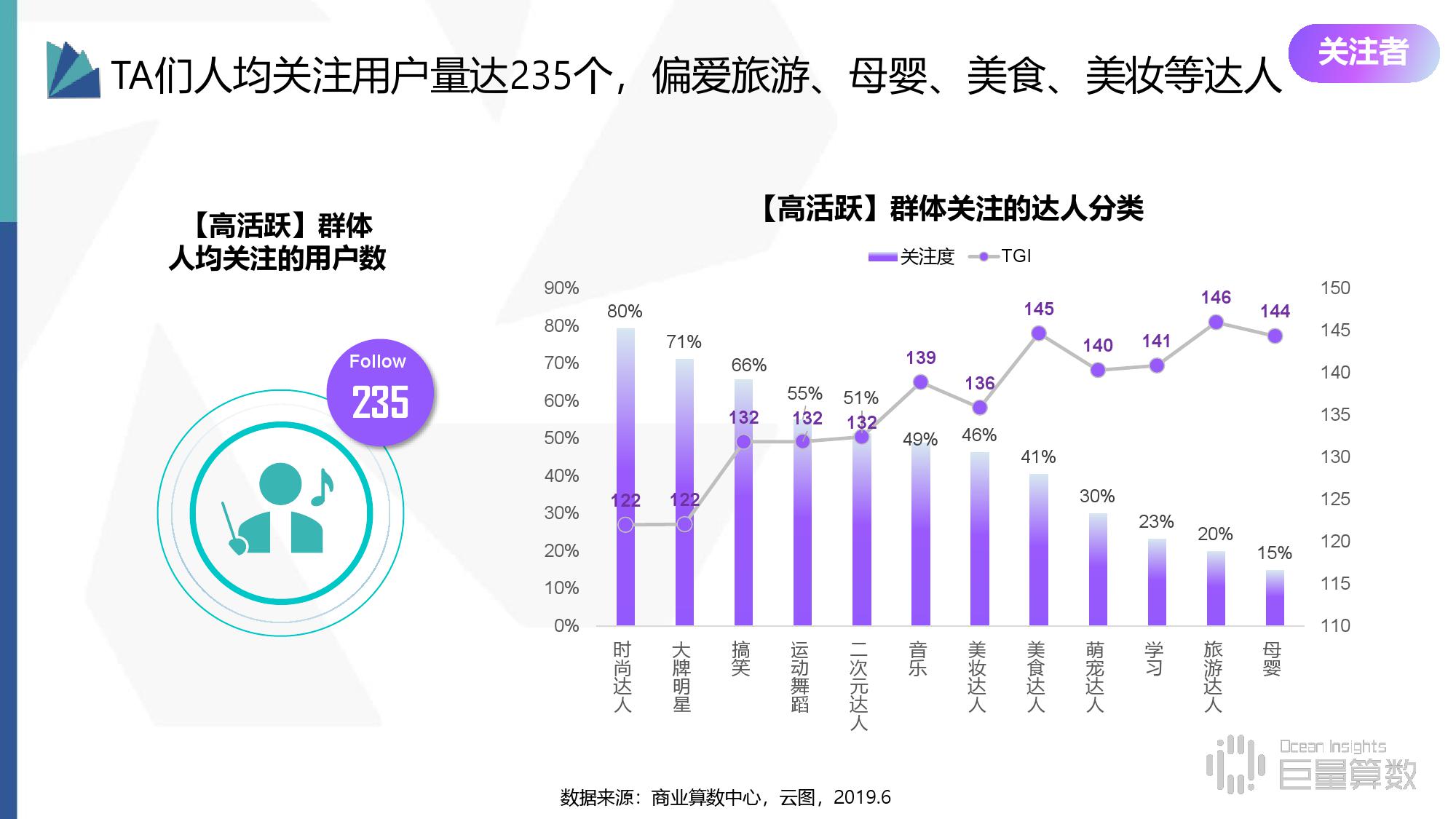 • 达人关注:人均关注用户量达235个,偏爱旅游、母婴、美食、美妆等达人。