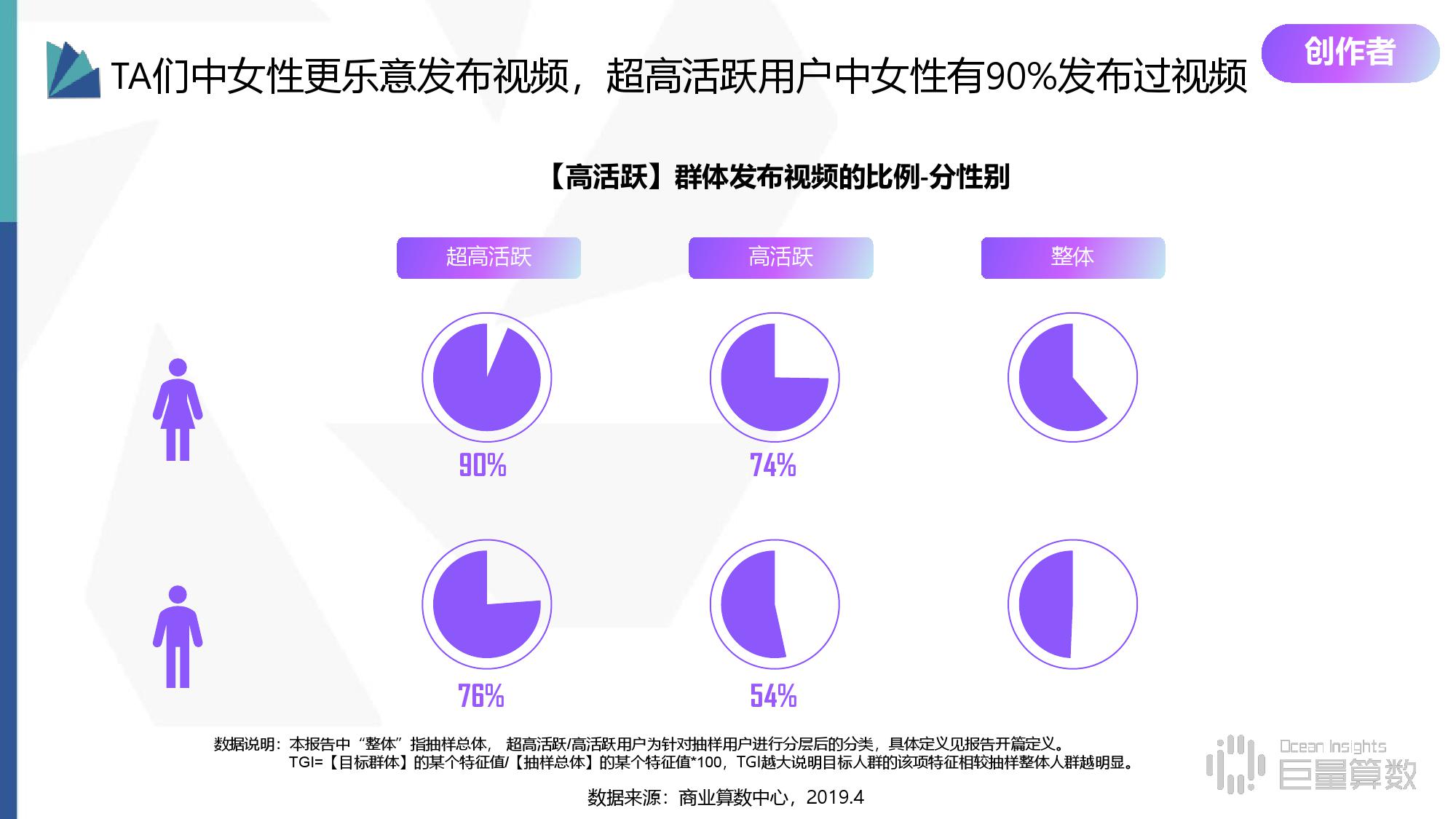 • 参与情况:超六成用户是抖音视频创作者,日均发布量是整体的1.5倍,且发布量持续提升,女性用户尤为明显 。