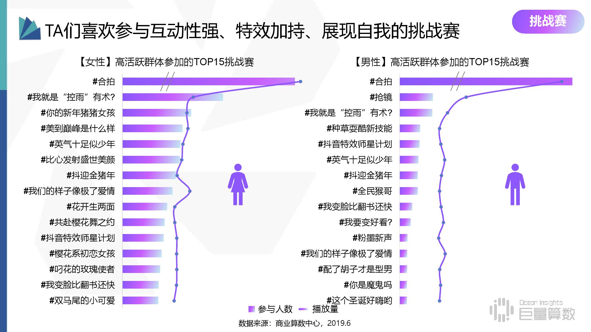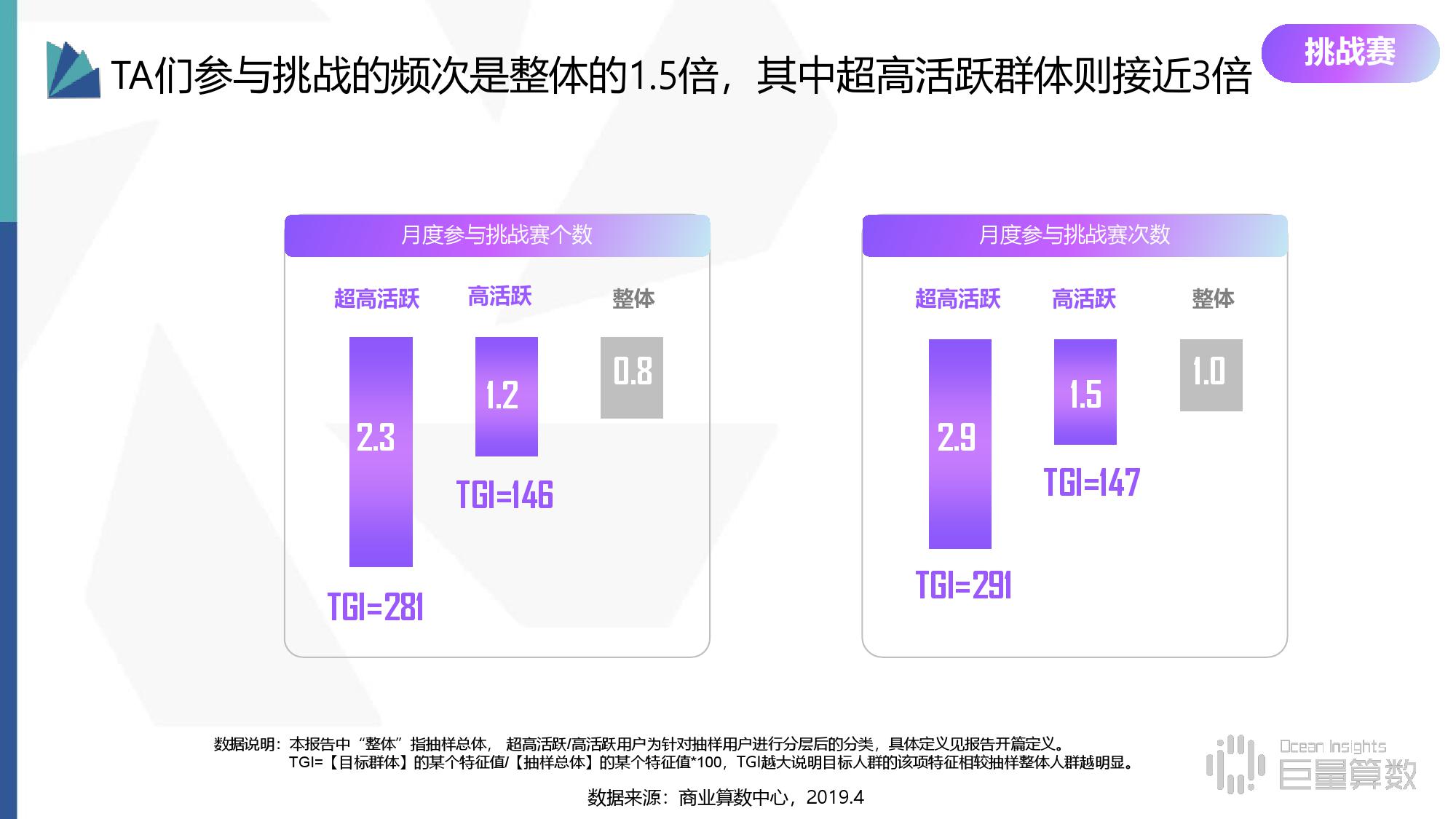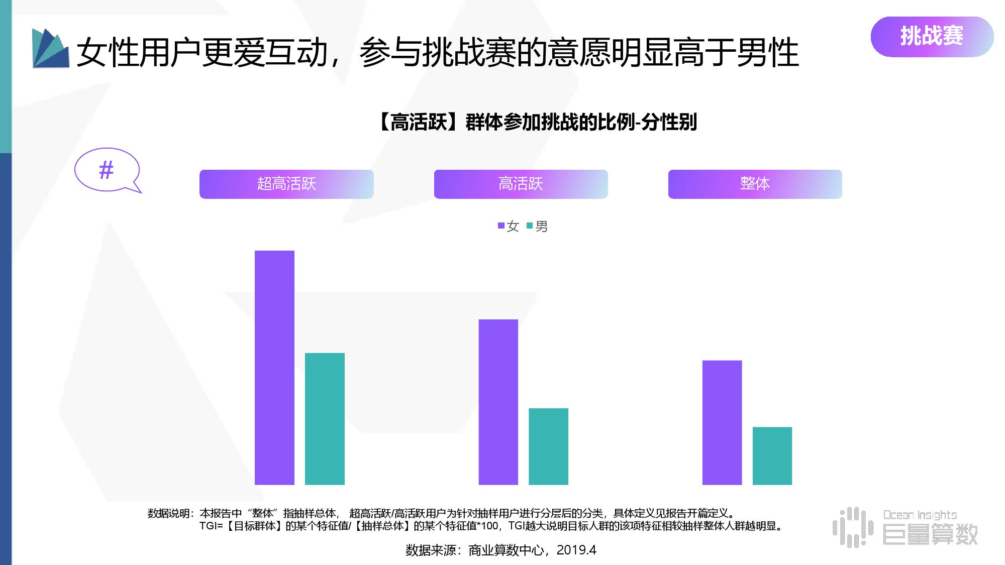 • 挑战赛:参与挑战的频次是整体的1.5倍,其中超高活跃群体则接近3倍,女性用户的意愿显著高于男性。