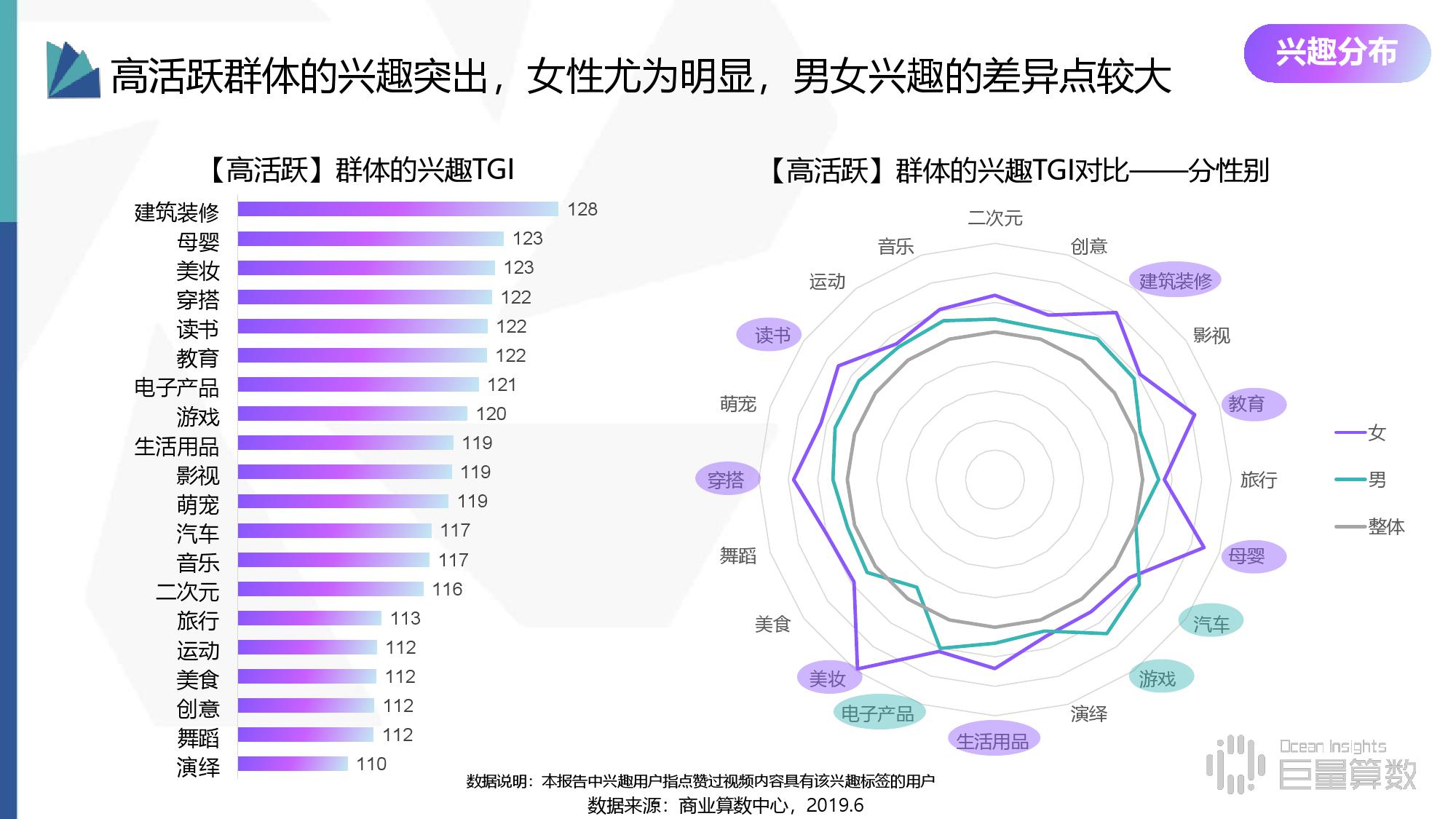 • 兴趣渗透:高活跃群体兴趣突出,女性尤为明显,男女兴趣的差异点较大