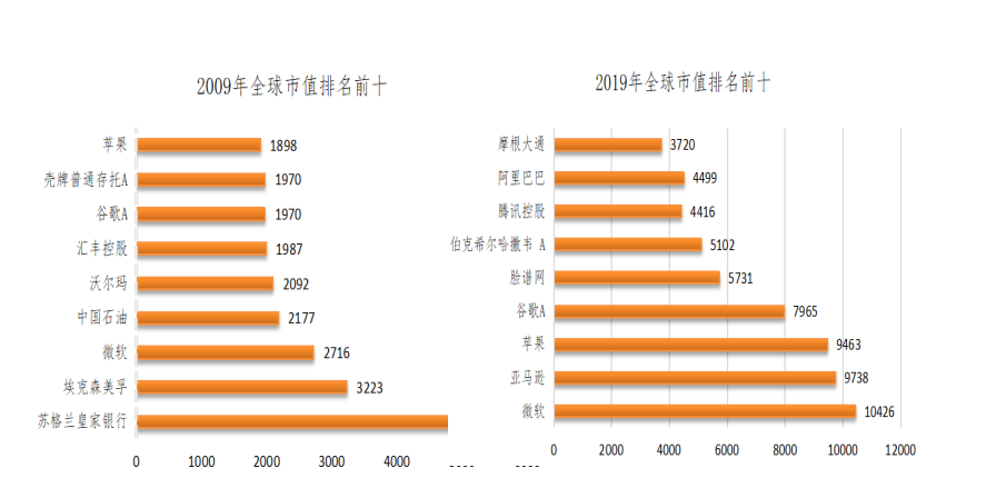 每一次技术革命将推动着全球产业进行一次更新换代。十年前,以美孚、苏格兰银行为代表的石油、银行等产业称霸全球市值排名榜;十年后的今天,此榜全面大洗牌,微软、亚马逊、苹果等科技公司乎占据榜单七成,能够在二十年中稳居前三甲的只有一家企业——微软!