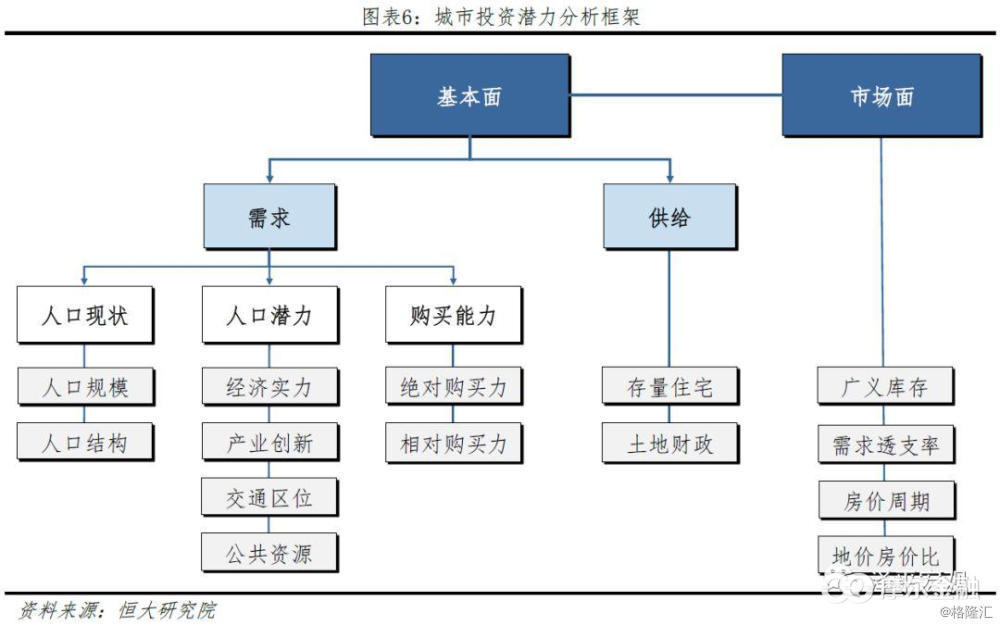 基本面分析是城市发展潜力研判的核心,关键在于研判人口趋势,逻辑链条是:人随产业走,产业布局决定于区位。其一,房地产长期看人口,人口决定需求。人口是一切经济社会活动的基础,更是房地产市场发展的根本支撑。由于出生人口大幅下滑,2018年中国人口仅增加530万,人口总量将在2024-2031年见顶,各地区已逐渐进入人口争夺的存量博弈时代。人口迁移的根本动力在于实际收入和生活水准差距,一般规律是人随产业走、人往高处走。其二,产业决定城市兴衰,产业兴则城市兴,产业聚则人口聚。当前中国经济从高速增长阶段转向高质量发展阶段,从全球价值链的中低端向中高端转型升级,区域产业格局明显变化。从地区层面看,东部沿海大量制造业受成本上升影响,已经并正向中国内地、东南亚转移。从城市群角度看,发达城市群内核心城市集聚高端制造和高端服务业、向周边转移一般制造业,发育中都市圈城市群制造业继续向核心城市集聚,城市群外一般城市产业结构多呈现低端制造业化和低端服务业化。其三,区位决定产业布局,规模经济和交通成本决定区位。企业产业布局以最大化利润为目标,区位选择至关重要。但区位因素并非一成不变的,随着规模经济和交通成本等因素变化。中国东部沿海地区率先发展的关键并非是率先开放的政策,而是沿海的地理位置有利于出口;从全球看,约60%的经济总量集中在沿海100公里范围内。高端制造和高端服务业聚集在核心大城市,主要是因为规模经济带来的成本下降和效率提高。