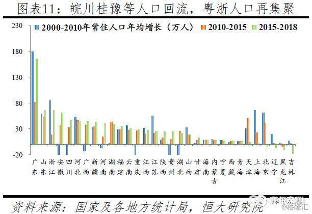 从区域层面看,当前人口回流皖川桂豫等中西部省份与粤浙等东部省份人口再集聚并存,京沪津苏黑吉辽人口增长低迷甚至负增长。改革开放后至2010年左右,人口大规模向出口导向型的沿海发达地区流动。2010年以来,随着沿海地区产业转型升级、中西部地区产业承接以及老一代农民工老化,部分人口逐渐回流中西部,东部人口增速总体减缓,而东北地区人口开始负增长。当前人口回流明显的是安徽、四川、广西、河南、贵州等省,安徽常住人口年均增量从2000-2010年的-33万回升至2010-2015年的37万,再增至2015-2018年的60万,四川从-56万回升至32万,再增至46万。广东、浙江等省常住人口增长一度受人口回流而明显放缓,但2015-2018年人口重新明显集聚,当前年均增量分别为166、66万。江苏则从2000-2010年的54万降至2010-2015年的22万,2015-2018年为25万、无明显起色,江苏与广东的人口集聚差异类似经济发展差异,2016年开始两地经济总量逐渐拉大。