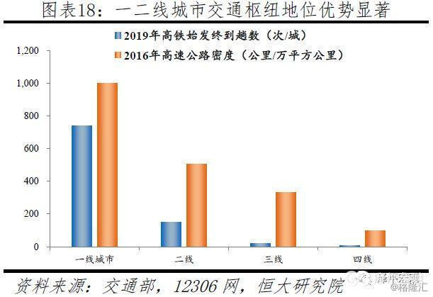 在交通区位方面,一二线城市占据交通枢纽地位,高铁日始发终到趟数分别高达740、149趟,东部地区受益于自然地理和率先发展战略交通基础条件更优。从自然地理看,东部沿海地区具有先发的区位优势。在东部率先发展战略下,高铁、高速公路等交通基础设施发展迅速,特别是珠三角、长三角、京津冀等地区。从高铁通达度看,一线、二线、三线、四线城市高铁日均通行班次分别为974、460、155、54趟;目前尚有107个城市未开通高铁,主要分布在中西部地区。从高铁日始发终到趟数看,一线、二线、三线、四线城市分别平均为740、149、17、6趟,其中广州、上海、北京、深圳、成都、武汉、重庆、天津、长沙、西安位居全国前十。从高速公路看,一二线城市与三四线城市的路网密度差异仍然十分明显,分别为1001、506、330、99公里/万平方公里,四线城市仅为一线城市的10%。2016年国家发改委《铁路网中长期规划》要求,在“四纵四横”高速铁路的基础上,建设形成以“八纵八横”主通道为骨架、区域连接线衔接、城际铁路补充的高速铁路网。其中八纵是指沿海通道、京沪通道、京港(台)通道、京哈~京港澳通道、呼南通道、京昆通道、包(银)海通道、兰(西)广通道;八横是指绥满通道、京兰通道、青银通道、沿江通道、沪昆通道、厦渝通道、广昆通道。