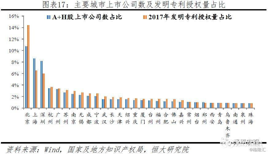 在产业创新方面,一二线城市头部效应明显,京沪深占据绝对高地,杭州、广州、苏州、南京、成都等城市居前。产业创新的城市差异比经济实力更加明显,这主要因为创新需要高度集聚才更有效率。从反映龙头企业的A+H股上市公司数来看,北京占全国的比重达10.7%,京沪深合计占比高达27.5%,一二线城市合计占69.9%。从发明专利授权量来看,北京由于占尽产学研资源优势而独占全国的14.4%,京沪深合计占26.8%,一二线城市占比达到75.5%。产业创新排名相对靠前的三线城市主要是绍兴、常州、台州、嘉兴、珠海等长三角、珠三角城市。