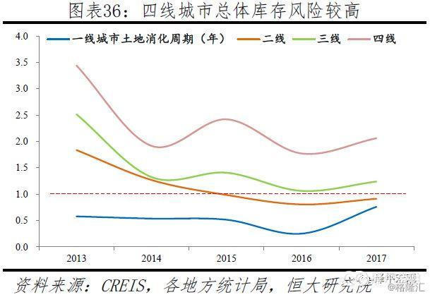 从广义库存看,西部地区、四线城市库存偏高,2017年土地消化周期分别为2.5、2.1年。分地区看,东部、中部、东北地区库存持续改善,西部地区库存改善力度明显不足。2017年,东部、中部、东北地区土地消化周期均在1.15-1.35年之间,而西部地区则高达2.5年。分线城市看,2017年一线、二线、三线、四线城市土地消化周期分别为0.8、0.9、1.2、2.1。尽管一线城市受2016年930开始的调控收紧影响,市场销售持续降温,但土地消化周期基本小于1;四线城市销售乏力,土地供应持续增加,仍有较大库存风险。