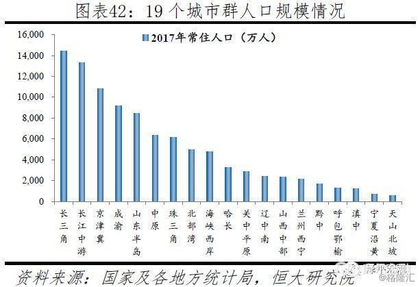在城市群层面,19个城市群的核心在于京津冀、长三角、珠三角、长江中游、成渝等5个城市群。2014年《国家新型城镇化规划(2014-2020年》及“十三五”规划要求建设长三角、珠三角、京津冀、山东半岛、海峡西岸、哈长、辽中南、中原、长江中游、成渝、关中平原、北部湾、山西中部、呼包鄂榆、黔中、滇中、兰州-西宁、宁夏沿黄、天山北坡等19个城市群。其中,长三角、珠三角、京津冀三大城市群是其中最成熟的三个,以全国5%的土地面积集聚了23.3%的人口,创造了39.3%的GDP,成为带动中国经济高质量发展和参与国际经济合作与竞争的主要平台,目前均已经上升为国家战略。在三大城市群外,以成都、重庆、武汉为核心的成渝、长江中游城市群最具发展潜力,两大城市群以5.2%的土地面积集聚了15.5%的人口,创造了15.6%的GDP。其次则是山东半岛、海峡西岸、中原、关中平原、哈长、辽中南等城市群。预计到2030年,中国2亿新增城镇人口的约80%将分布在19个城市群,其中约60%将分布在长三角、珠三角、京津冀、长江中游、成渝、中原、山东半岛等七大城市群(参见恒大研究院2018年7月报告《中国人口大迁移》)。