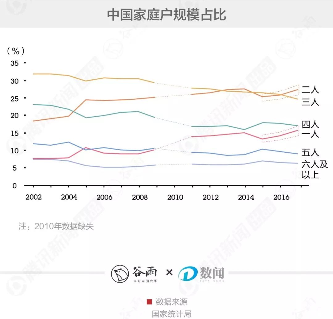 种种原因下,2015年开始,中国一人户和二人户的数量不断增长。2017年,二人户已经超过三人户,成为最主流的家庭户型。