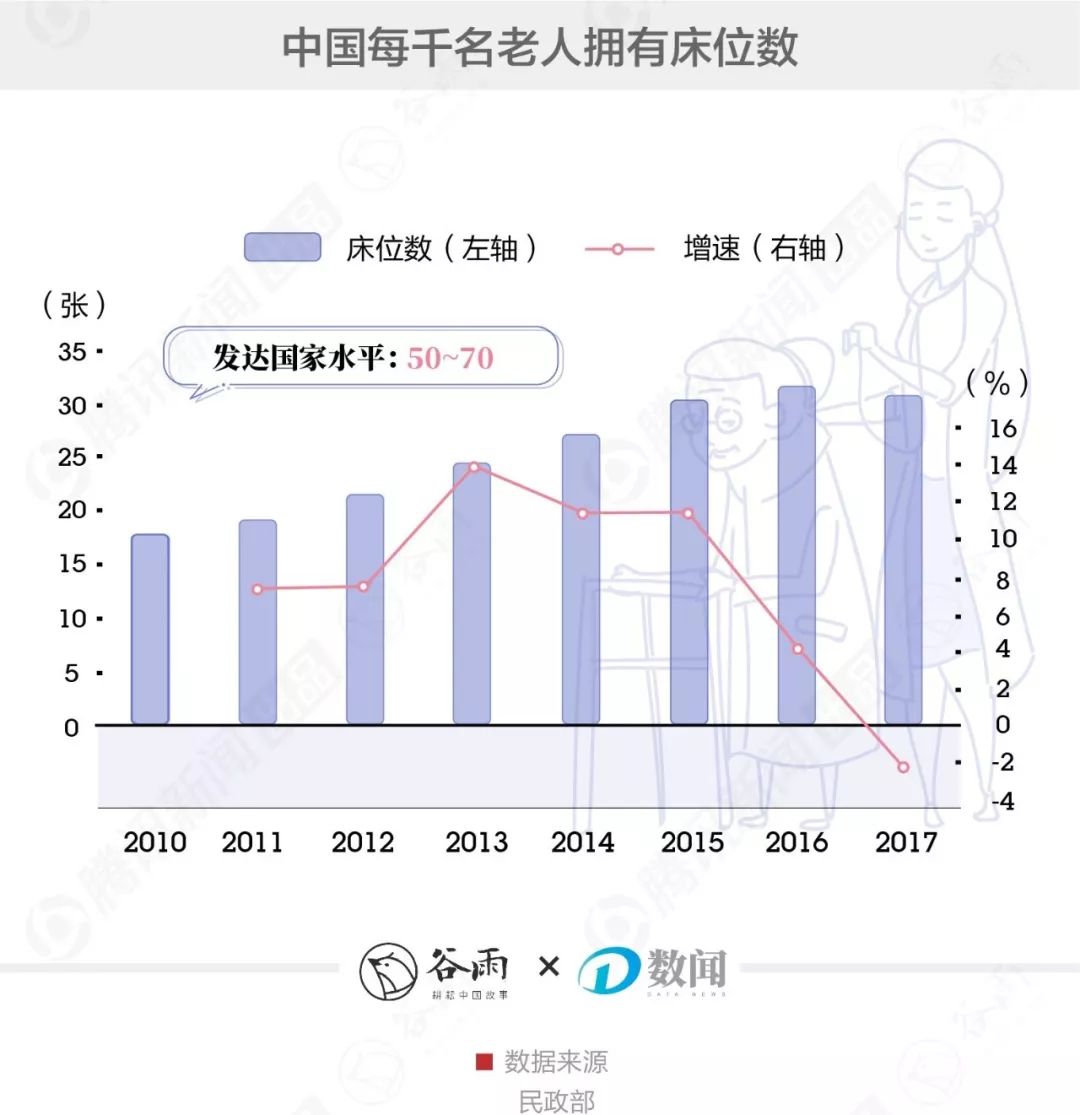 2016年,中国每千名老人仅拥有31.6张床位,为近年来最高,但距离发达国家50-70张的水平差距还是较大。