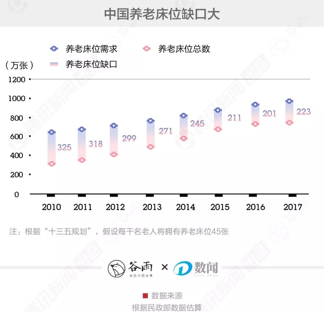 虽然养老床位一直在增加,但老年人也一直在增加。“十三五规划”提出了“每千名老人拥有养老床位35-45张”的目标,如果要达到45张,2017年底的养老床位缺口估计仍然超过200万张。