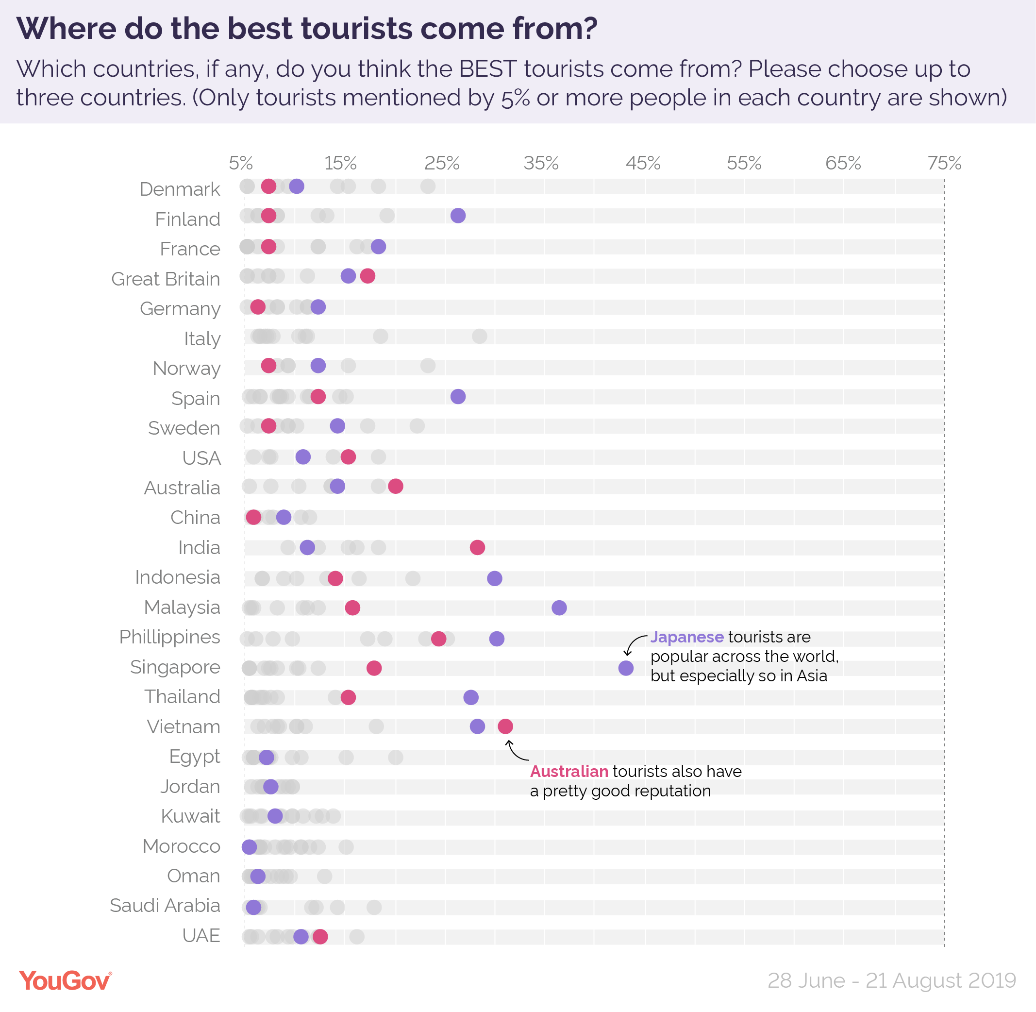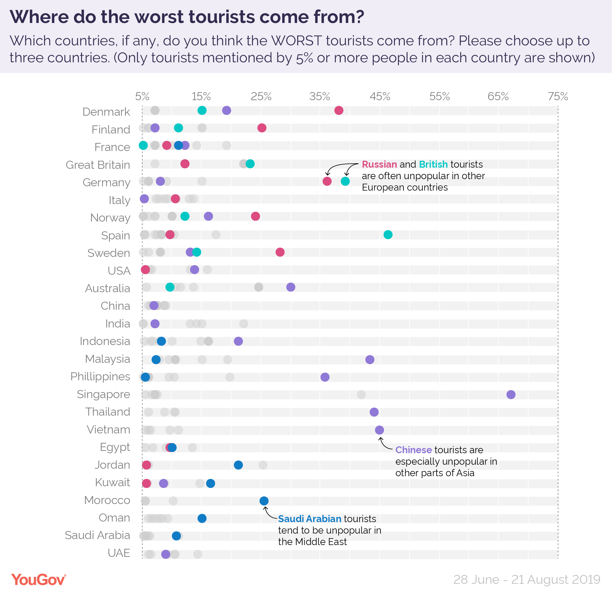 在欧洲不受欢迎的还有俄罗斯游客,特别是在丹麦、瑞典、芬兰和挪威(在24%-38%之间)。还有36%的德国人将俄罗斯游客列为世界上最糟糕的游客之一。