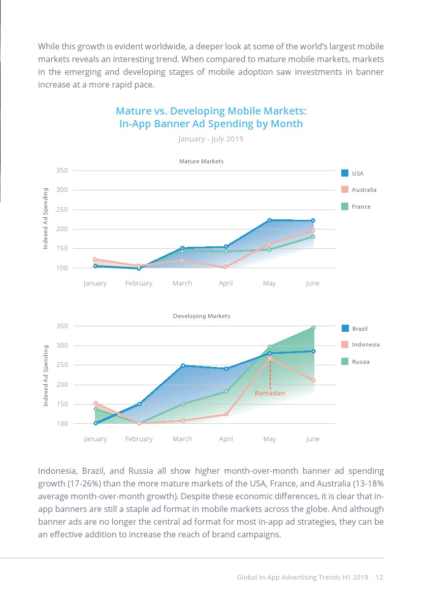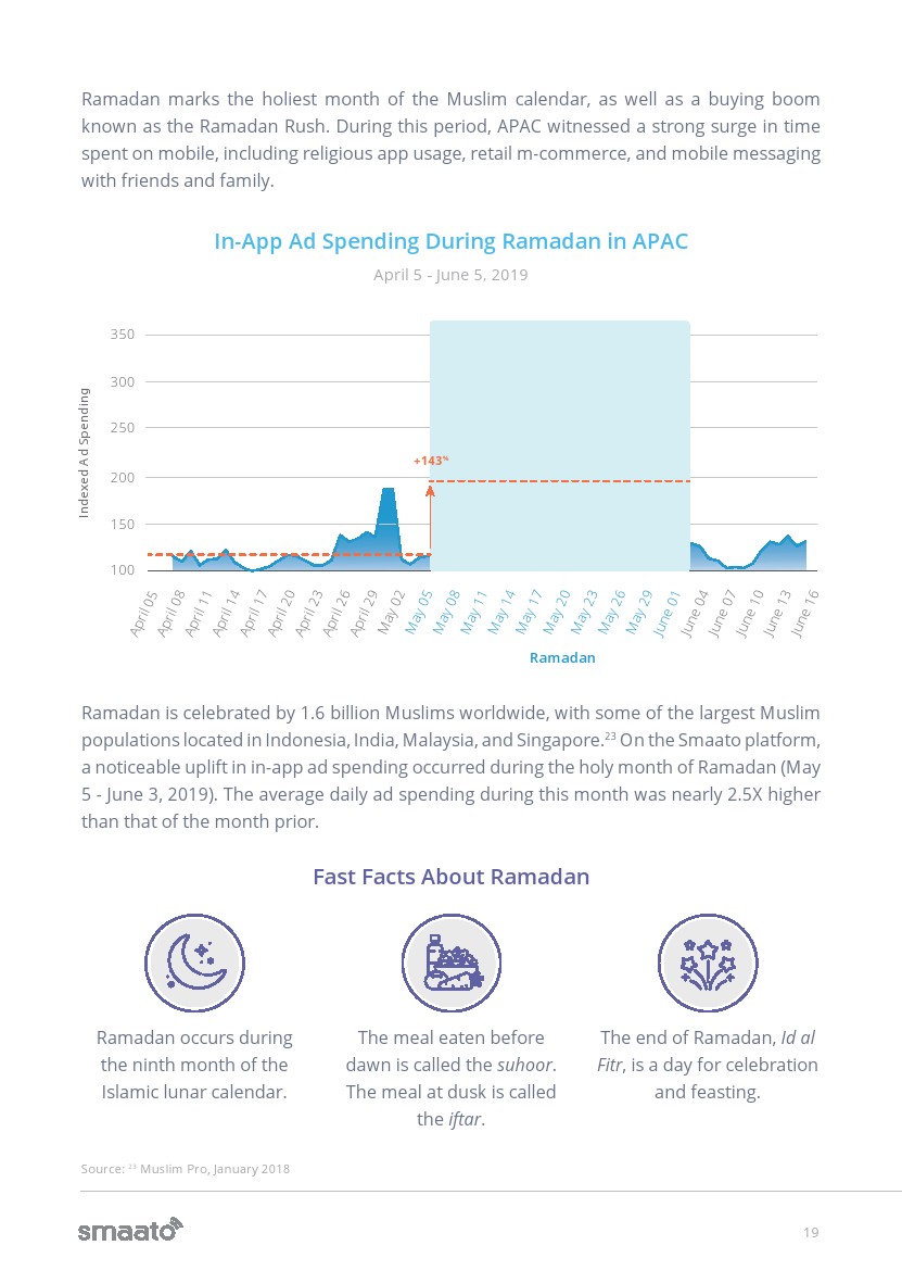 广告客户在2019年上半年收到大量来自亚太地区顶级市场的视频广告请求。同时,这些国家/地区的广告请求增长高达281%。在斋月和农历新年等假日期间,亚太地区的日常应用内广告支出也出现了显著增长。