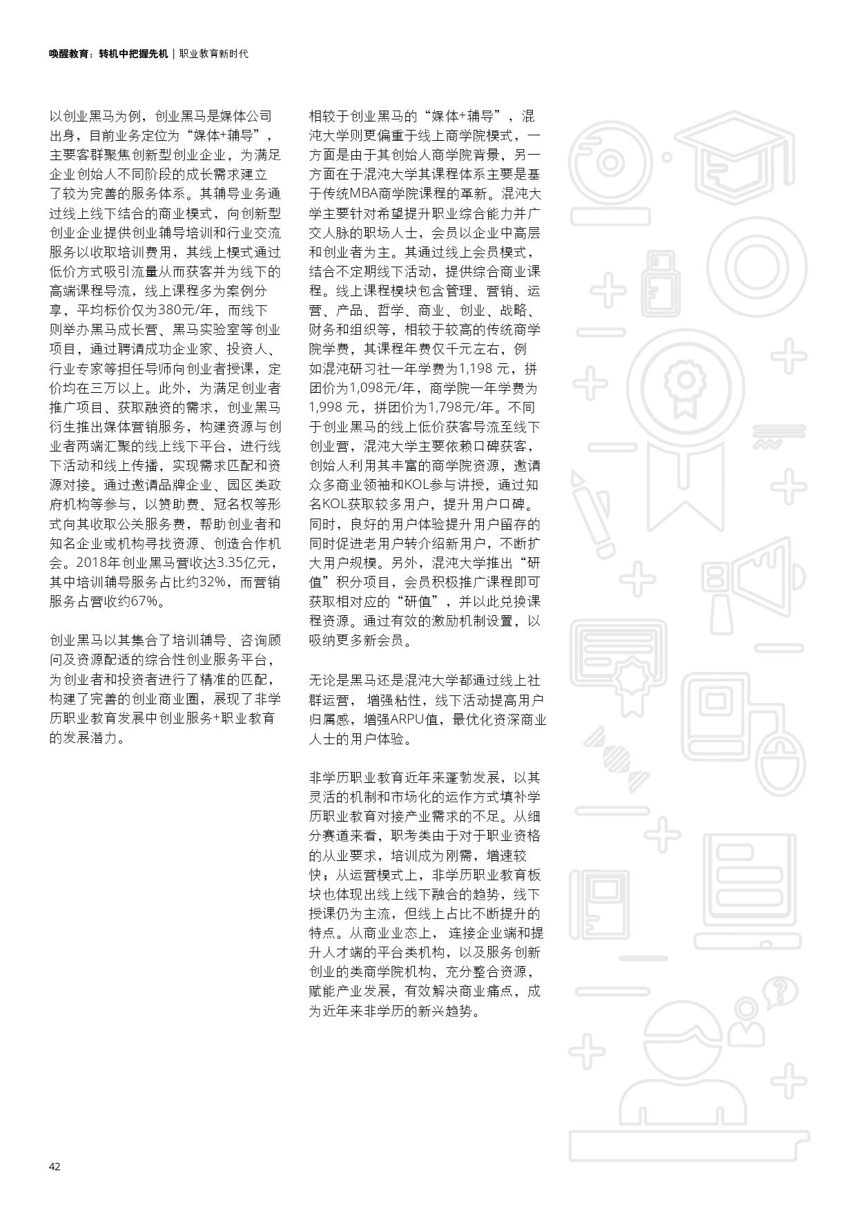 - 传统非学历培训板块未来仍然存有较大刚需,随着工作转换频次的增加、职场生命的延长、产业结构的升级和创业热度的提升,“招聘+职业教育”和“创业创新+职业教育”成为了非学历培训的新兴趋势。