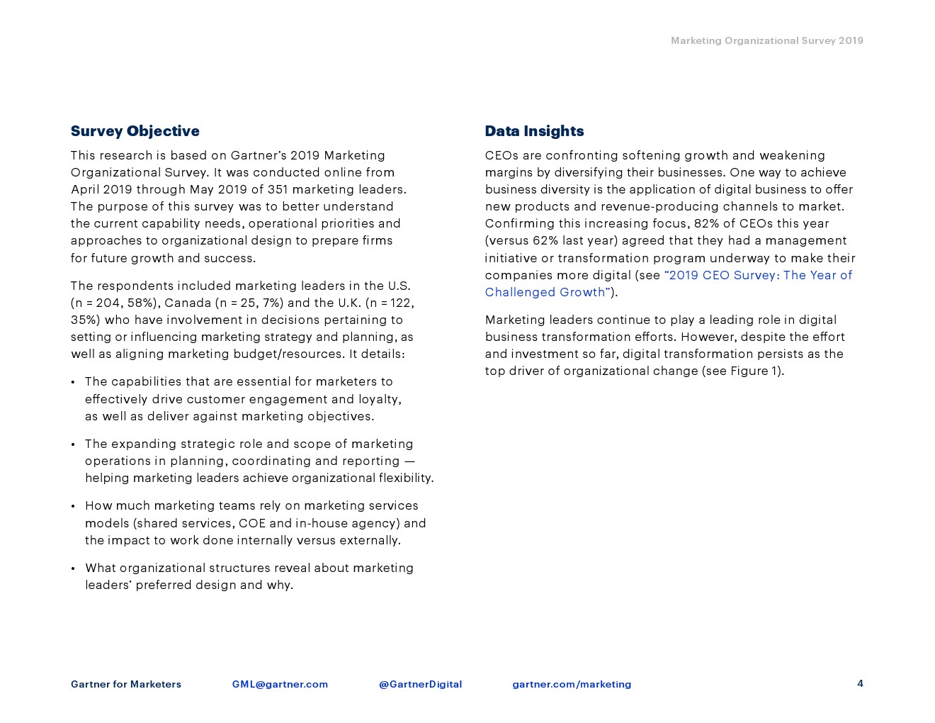 Gartner发布了报告“2019年营销组织调查”。2019年4月-2019年5月Gartner对美国、加拿大和英国351个市场营销负责人进行了在线调查。目的是更好地了解当前的能力需求、运营优先级和组织设计方法,以帮助公司为未来的增长和成功做准备。