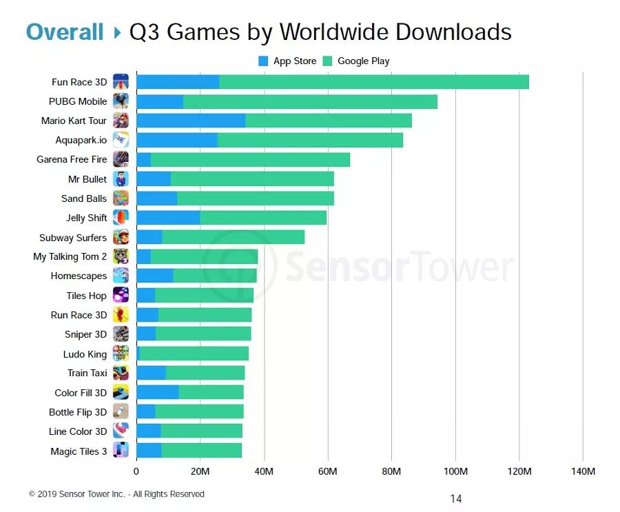 - 下载量最高的是超休闲游戏Fun Race 3D,超过2亿次,也是唯一一款过亿下载手游;