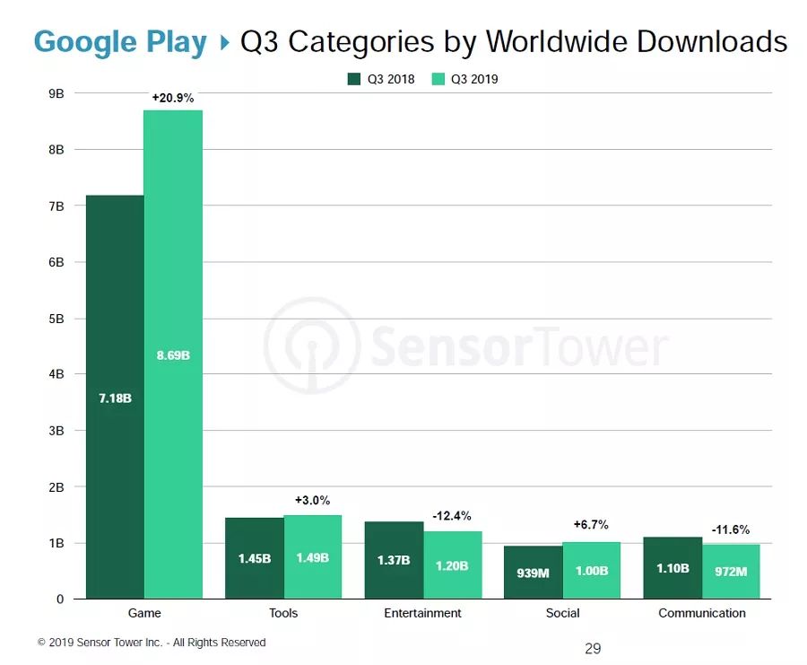 并且,Q3下载量同比增长方面,Google Play的11.4%,也要高于App Store的5.3%,二者之间的差距进一步扩大中。