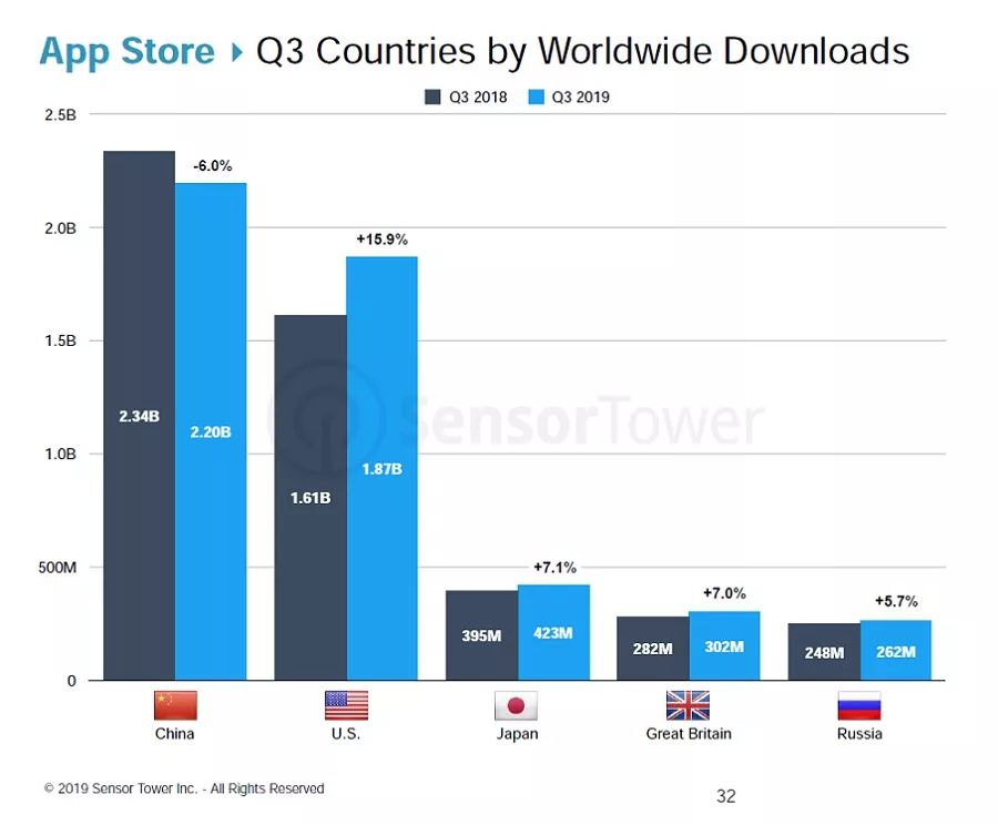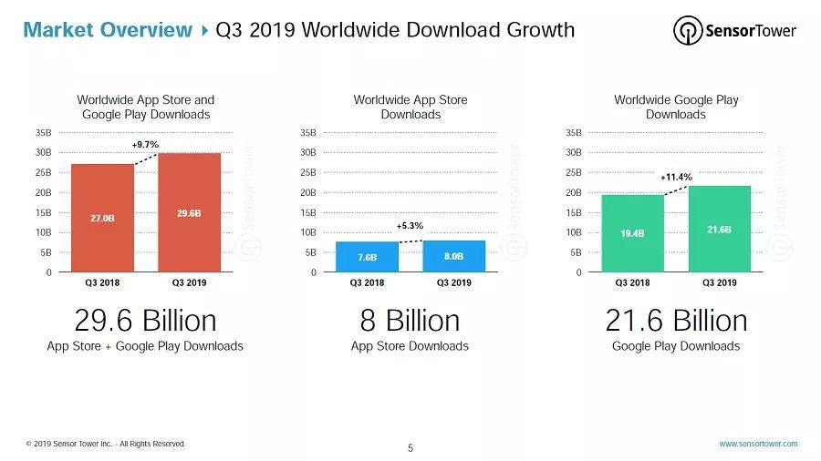 2019年Q3,全球应用市场下载量达296亿次,同比增长9.7%。其中,App Store贡献了80亿次,Google Play则贡献了余下的216亿次,从下载量上看,Google Play约是App Store的2.7倍。