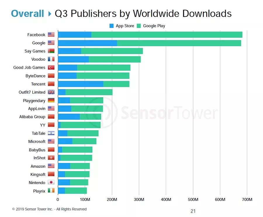 超休闲游戏发行商之后,才出现第一家来自中国的发行商字节跳动(第6名),由于当前字节跳动海外并非上线游戏发行,因此真正意义上的的第一家中国游戏发行商是获得2.7亿次下载量的腾讯(第7名)。
