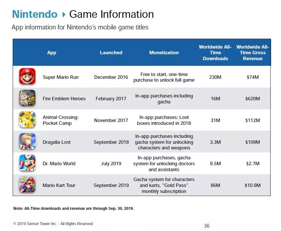 《报告》特别统计了任天堂所有6款手游,自上线至今的下载和收入成绩,下载最多的是《马力欧酷跑》的2.3亿次,收入最好的则是《火焰纹章英雄》的6.2亿美元。而截至2019年Q3,任天堂手游共创造了3.74亿次下载,和9.28亿美元收入。