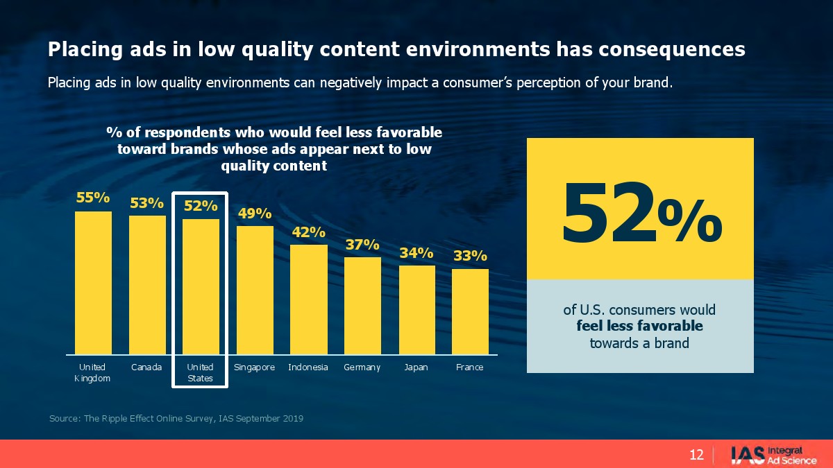 当一个品牌出现在低质量内容旁边时,大多数美国消费者(81%)感到恼火。在这些消费者中有52%觉得这样做的品牌不太受欢迎。最令人担忧的是,如果该品牌的广告出现在低质量内容附近,62%的人将完全停止使用该品牌。