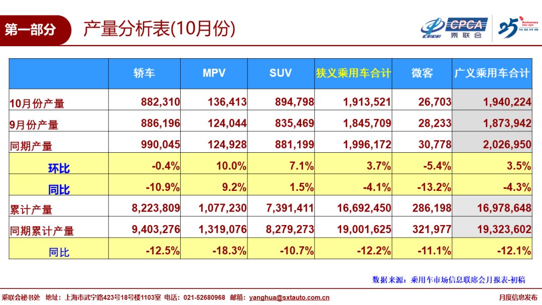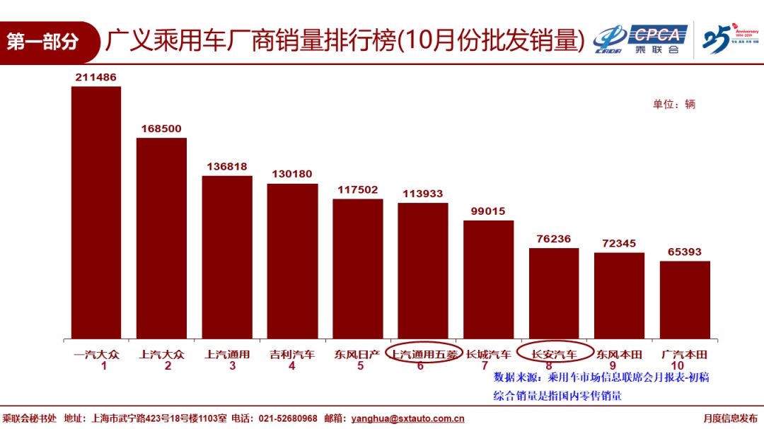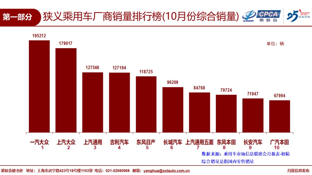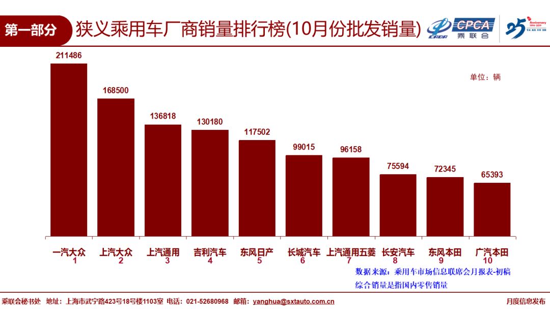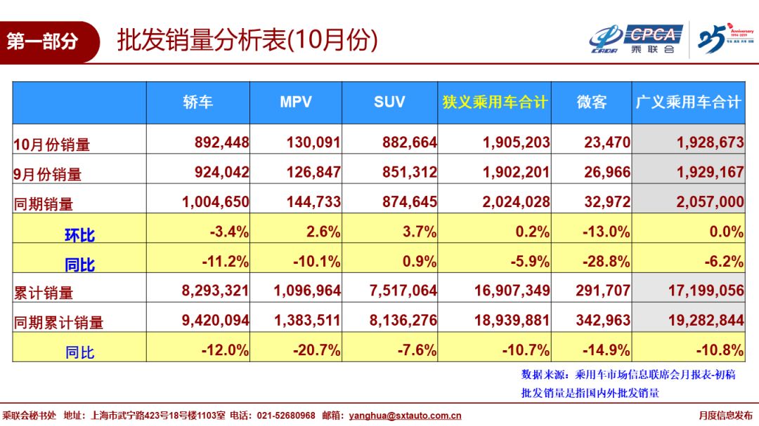 中国汽车流通协会:2019年10月份全国乘用车市场分析 1、10月全国乘用车市场回顾 零售:10月全国乘用车市场零售184.3万台,同比下降5.7%,今年1-10月狭义乘用车零售同比下降8.3%,10月零售环比增长3.5%,相近于2018年的10月环比走势,终端消费不温不火,消费需求不旺。 10月的零售仍属偏弱走势,主要因素是消费需求不足,应有的冬季回暖走势不强。消费购车能力和信心暂时受到影响。近期出口下行压力加大、随着猪肉等必选消费品的价格上涨,基础生活消费水平提升,加之房地产销售超预期,居民消费结构性挤压加大,汽车等可选消费品的消费热情不高。 从车系版块看,自主品牌回暖缓慢,日系新品切换暂时抑制增速,虽然大众表现优秀,但欧美系总体不强。 10月SUV市场零售同比下降0.7%,其中大众SUV新品推动其销量达到8.5万台,同比去年10月提升90%,对SUV增量贡献度巨大。 10月轿车零售仍同比下降9.1%,相对19年累计降幅9%基本持平。10月MPV同比下滑13.6%,好于年累计下滑19%较多。 10月消费升级稍好,但入门级消费乏力仍较明显,豪华品牌零售同比去年10月增速14%,主流合资品牌同比下降3%,自主品牌同比下降12%。 批发:10月厂家批发销量190.5万台,同比下降5.9%,环比增长0.2%,相对历年的10月稍强于九月的银九金十表现,今年10月的批发环比提升不强,对于全年市场走势也趋于理性。 10月渠道库存上升1.3万台,10月零售偏弱体现市场零售走势不强,经销商谨慎提车。车企分化走势加剧,长城、吉利、上汽乘用车等自主燃油车龙头车企表现较好。 产量:10月乘用车生产191.4万台,同比18年10月下降4.1%,环比9月增长3.7%,厂家库存较9月下降0.1万台。虽然部分企业国六车型的逐步到位,但企业生产安排极其谨慎,亟待市场反馈速度升级。 新能源:10月新能源乘用车批发销量6.6万台,同比下降45.4%,环比9月增长1%。销量低迷主要是由于6月底补贴退坡带来的销售成本大幅上涨,叠加国六插混的短缺困扰。10月纯电动乘用车批发5.1万台,增速同比增长-46%,环比增长7%;其中A级电动车同比增长6%,A00级同比下降78%;限购城市新能源需求放缓且低线级市场新车需求相对低迷。10月插混车型批发销量1.46万台,同比下降44%,环比下降1%。 19年1-10月新能源乘用车批发84.4万台,同比增速17.0%。目前新能源市场仍持续处于退坡后的调整期,叠加二手新能源车的低价冲击,去年下半年纯电动A00级的持续拉升在今年没有出现。 10月普通混合动力乘用车批发2.8万台,同比去年10月增长38%;1-10月累计22.3万台,增速31%。日系混动保持绝对主力地位,并在持续加力。 2、11月全国乘用车市场展望 今年11月有21个工作日,相比去年少一个工作日,不利于车市产销提升。 11月的经济形势依旧复杂严峻,10月中采购制造业PMI指数从9月的49.8%回落至49.3%,其中10月新出口订单指数从9月的48.2%滑落至47.0%,外部不稳定不确定因素增多,虽然部分经济指标出现向好迹象,但多机构预测经济筑底有望出现在明年一季度。目前购车消费信心不是很强,换购群体的换车时间周期延长,到店客流呈现周期性回落,预计四季度和明年一季度车市零售整体规模很难出现显著回升,汽车企业也开始在调整年末年初的营销策略,力争2019年有个相对较好的着陆点,同时在制定2020年目标也会持谨慎态度。伴随着共享汽车平台的持续整合淘汰、网约车平台调整运营模式追求合规安全盈利体系,传统购车客户的出行需求有望通过集约化的网约车供给得以平衡。作为有效补充公共交通运行版图、稳步提升智慧交通出行满意度工具的网约车,也成为新能源汽车的重要消化途径,加上双积分政策的推动和地方政府新能源的支持政策,短期内汽车市场依靠新能源产品仍有望焕发市场活力。 11月车市更多需要依靠厂家经销商店的地方联展带动新车消费。随着基本消费品的支出增大,可选消费品的支出谨慎,近期购车热情也是相对较低的,不利于秋冬季增量。 考虑到全国国六排放实施时间节点及相应产生的过渡期,部分地区有望在11-12月迎来零售提前开票的国五扫尾清库的翘尾走势。 3、汽车行业效益逐步企稳 在整车厂家承担制造业转型升级的核心引领者、承担新能源产业链的全部社会责任和背景下,整车企业生存压力加大,由自身生存条件恶化引发的经销商利益不满也是可以理解的。对比其他消费品零售商,品牌优势对汽车品牌经销商仍能维持凝聚力和向心力,在深耕汽车市场多年的情况下,品牌经销商对于车市的发展、对品牌营销力的落地也将进入更理性全面的思考和执行。 自2017年以来,汽车行业效益持续下行,2018年利润下降5%,2019年1-9月下滑17%。随着国六排放标准的实施,行业减产去库存力度很大,乘用车企业销售收入和利润全面大幅下滑,一季度销售收入下降4%,利润下降25%,1-5月的销售收入下降8%,利润下降25%,国六标准实施之前的利润损失巨大。 由于生产的逐步恢复,车企效益在6月进入转折点,未来将逐步改善。按国统局数据,1-7月汽车行业利润下滑23%,1-9月汽车行业利润下滑17%,降幅收窄的趋势相对明显。在基数走低的情况下,企业的效益下滑趋势得到了一定的改善。 车市三季度开始进入加库存周期,生产和批发回升对车企及产业上下游效益改善促进很大。四季度和2020年汽车行业的效益应该有逐步改善的空间。 4、2020年市场预测微增长1% 10月IMF及几家著名投行都对世界和中国2020年GDP预测,总体看