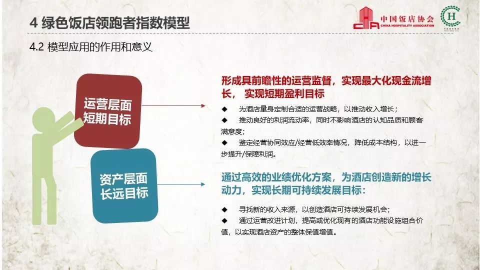 优尼华盛:2019年中国住宿业绿色发展 NO.2 首次将“绿色饭店”与“传统酒店”进行对比,深刻剖析绿色饭店的比较优势 NO.3 首次将“如何打造可持续发展的盈利型酒店”作为绿色饭店发展的目标 NO.4 首次推出“绿色饭店领跑者指数模型”,作为酒店资产管理的重要工具,指导酒店从开发建设到日常运营,再到翻新改造或退出的全生命周期 更多阅读:2017年3月中国住宿业平价酒店品牌发展报告MTA:2017年3月中国住宿业在线短租品牌发展报告中国饭店协会:2021中国住宿业市场网络口碑中国饭店协会&众荟:2021中国住宿业市场网络口碑报告(附精华版下载)MTA:2016年5月中国住宿业国内高端酒店品牌发展促进“一带一路”倡议绿色发展:发挥金融和技术的作用,推动低碳基础设施建设零碳之路:“十四五”开启中国绿色发展新篇章国家能源局:2025年我国全社会用电量达10.4万亿千瓦时,同比增长5%MTA:2017年4月中国住宿业国际高端酒店品牌发展报告在中国,只抓一个权健是不够的Crunchbase:2018年中国初创企业已经获得938亿美元投资劲旅咨询:2013年中国旅行社行业总交易额约为3174.3亿元胡润研究院:2014年中国奢华旅游白皮书中国旅游研究院:中国旅游景区发展报告2020龙途互动:中国定制游行业报告