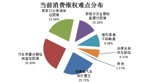 受访者认为,当前汽车消费维权的难点主要集中在汽车质量问题检测鉴定困难、消费者汽车知识匮乏、商家口头承诺举证困难等方面,分别占25.29%、23.72%、21.04%。