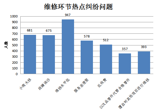 二是小病大修故障误诊。主要体现在:小病大修、故障误诊、维修水平低、服务态度差、乱收费、以次品零件代替合格零件、擅自对其他项目进行维修等,也有1945名受访者表示,对维修知识知之甚少,不知是否被侵权。